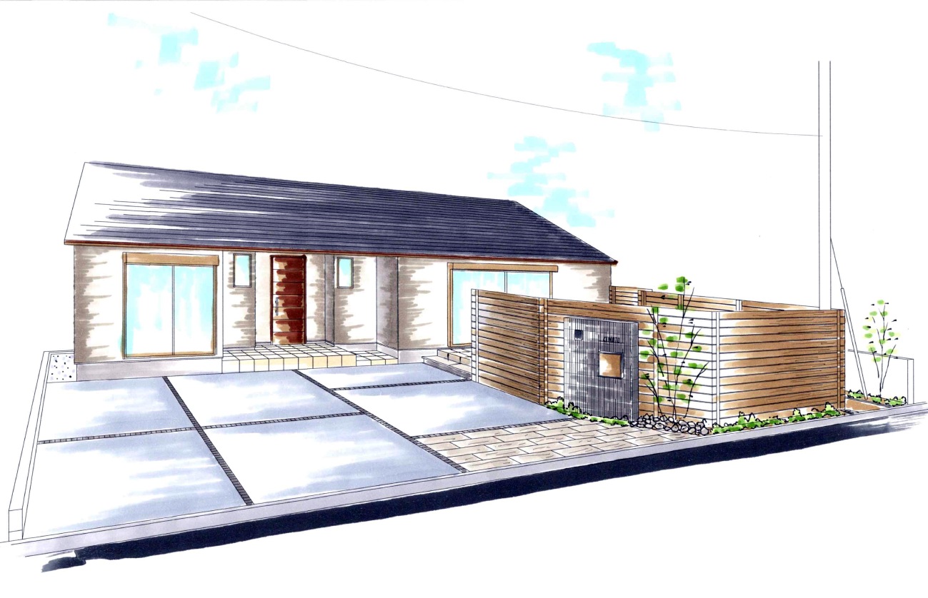 タイルテラスの面積はわずかに小さくなりますが、プライベート空間エリアを斜めにカットすることで門柱と来訪者をおもてなしするスペースが出来上がりました。