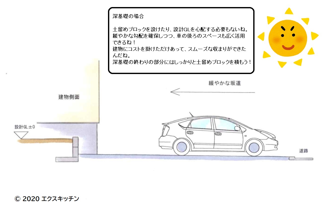 深基礎は接する道路と設計GLに大きな高低差が生じる場合、尚且つ表面の駐車場を広く活用したい場合に建築の方で計画されます。