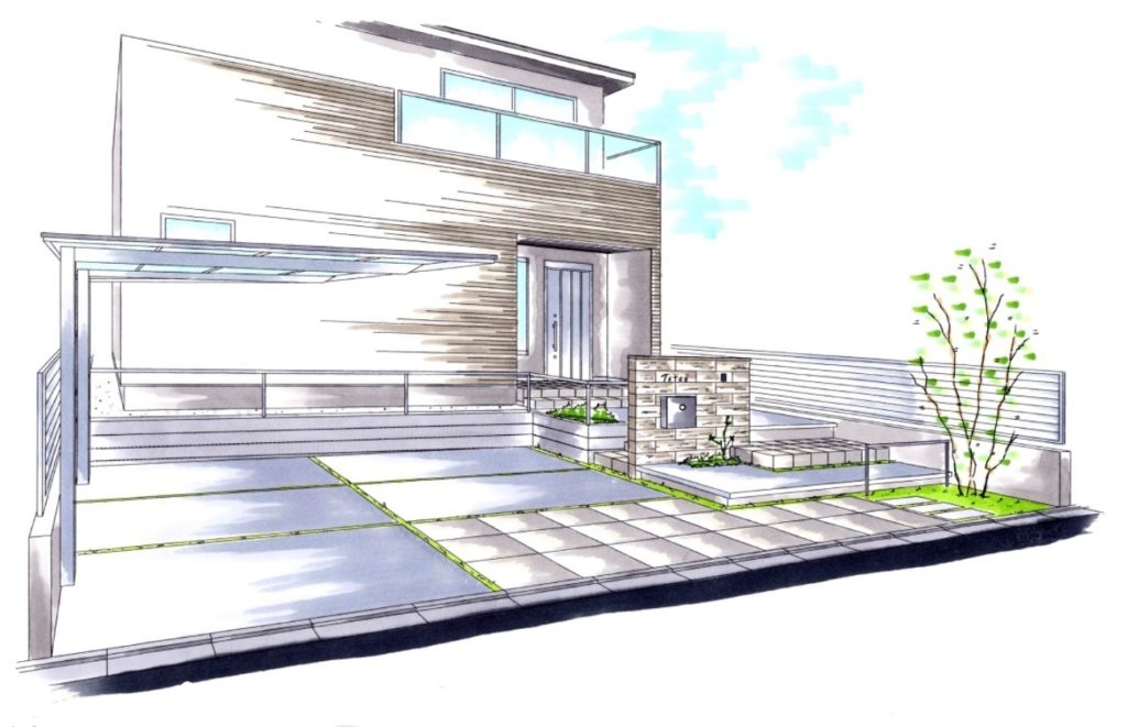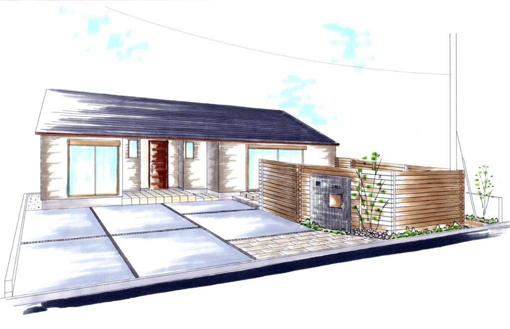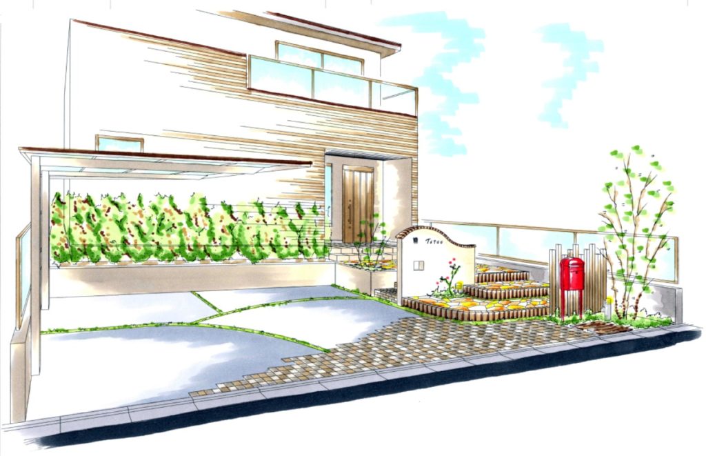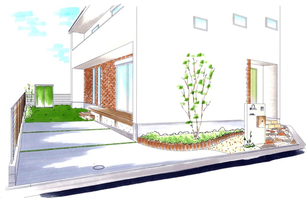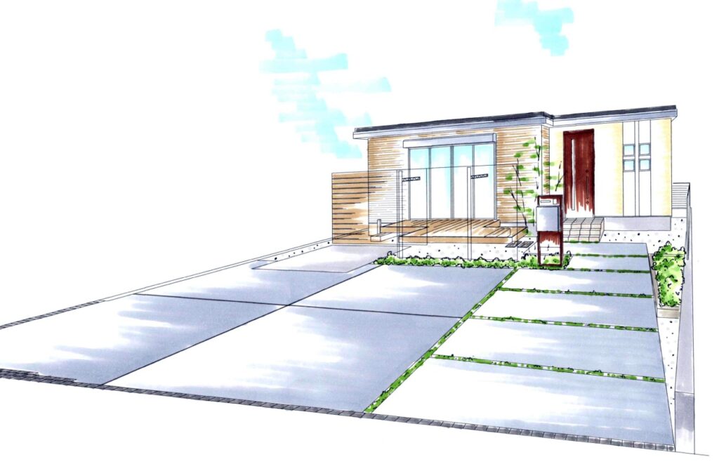 このページでは外構(エクステリア)のデザインプランを掲載しております。手書きによるイメージパースと平面図によるご説明を、素材・配置・形状等の意匠を少しばかり綴っております。各プランごとにページがございます。 詳しくはお問合せページよりお気軽にご相談ください。