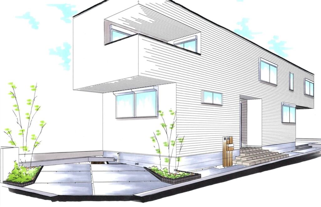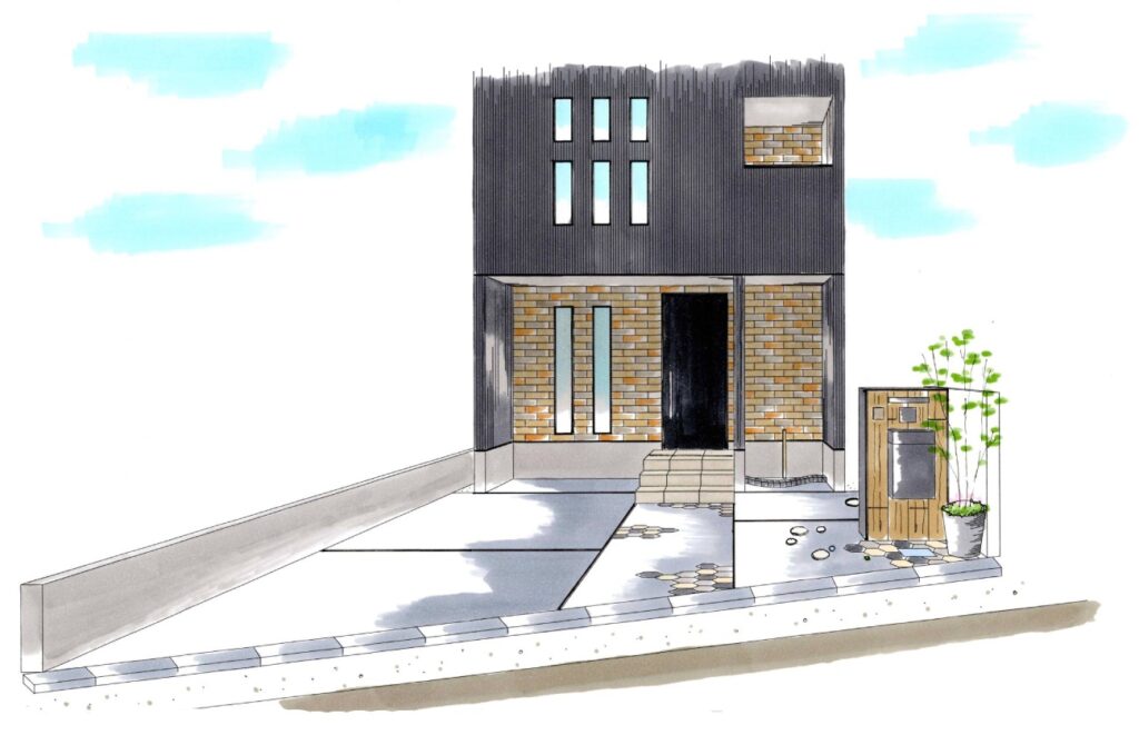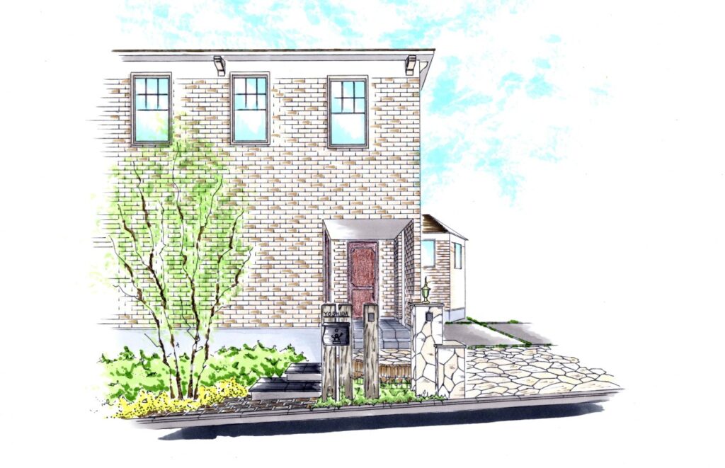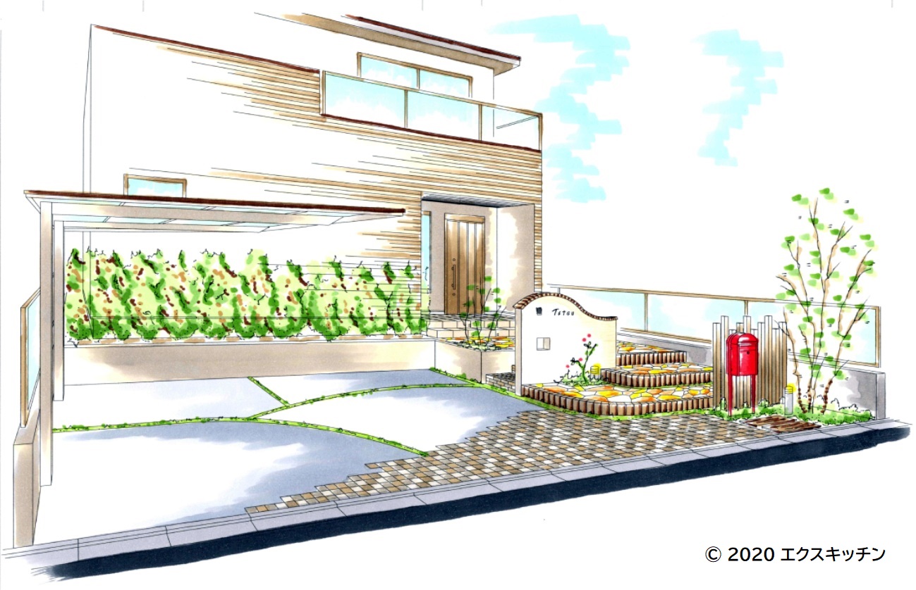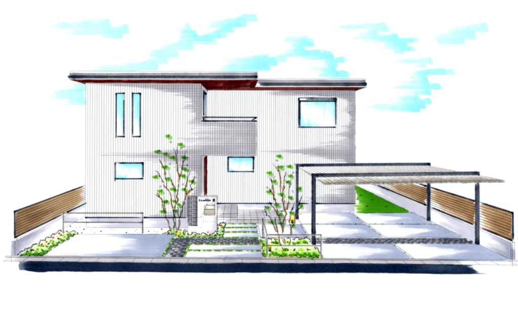 このページでは外構(エクステリア)のデザインプランを掲載しております。手書きによるイメージパースと平面図によるご説明を、素材・配置・形状等の意匠を少しばかり綴っております。各プランごとにページがございます。 詳しくはお問合せページよりお気軽にご相談ください。