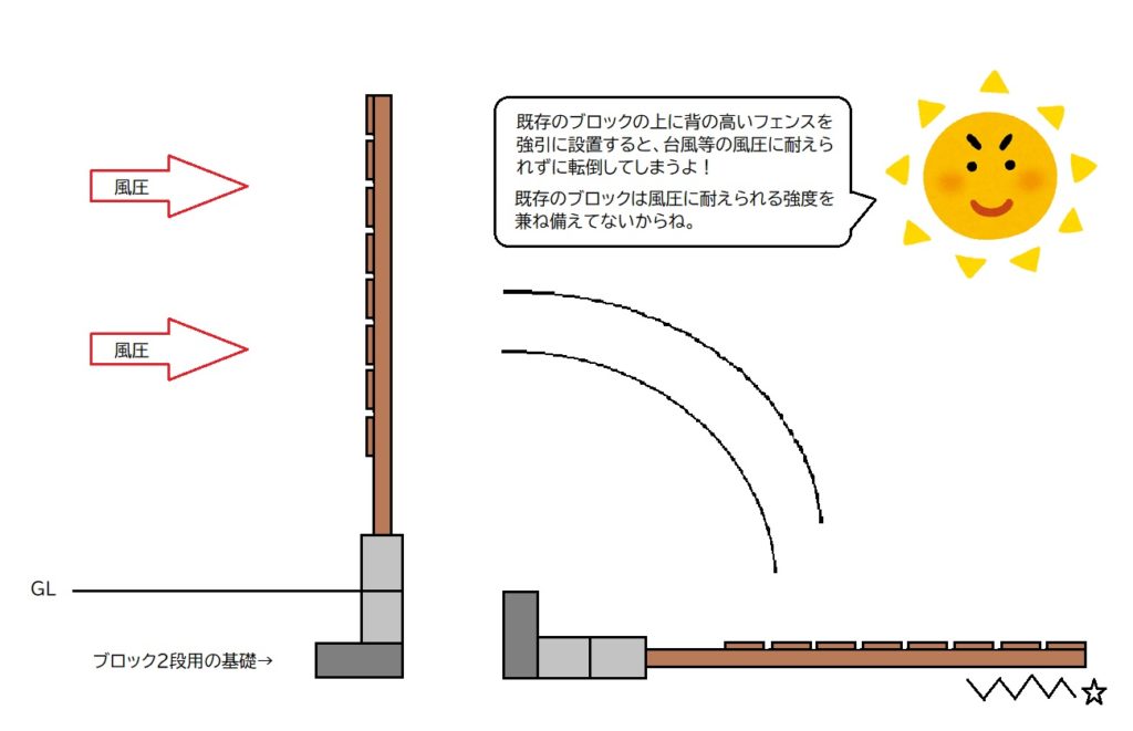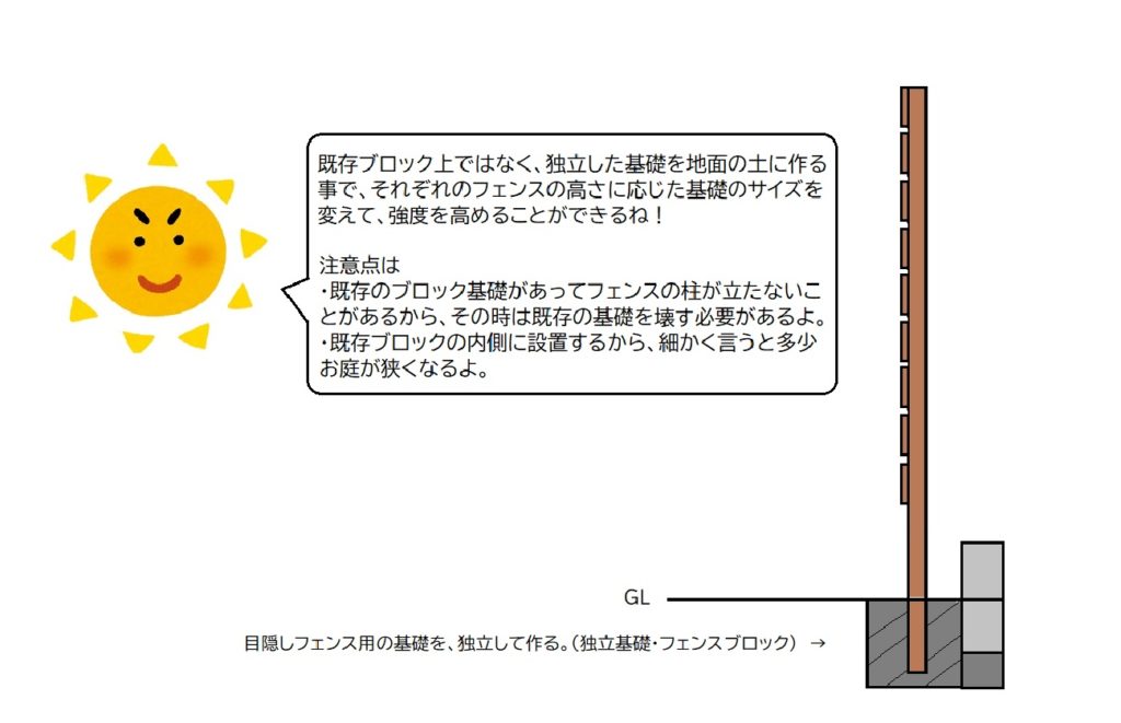境界沿いにフェンスを設置するという意味でイメージとしては大体あっていますが、目隠しフェンスの場合、高さが必要なので風圧に耐えられるだけの強度が柱に必要=柱が太い=ブロックの上には立てられないという事です。仮に強引に既存のブロックの上に柱が立ったとして、既存のブロックが目隠し程の強い風圧に耐えられる基礎を持ち合わせているでしょうか。答えはNOで既存のブロック分の強度を持つ基礎しか持ち合わせておりません。理由は目隠しフェンスが必要とする基礎のサイズは通常よりも大きいので、わざわざ労力と材料費をかけて「未来の目隠しフェンスを付けるかもしれない方」の為にブロックの基礎を作る業者さんは全国を探してもいらっしゃらないでしょう。