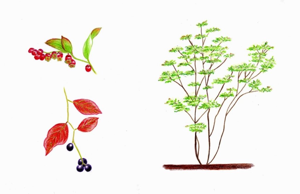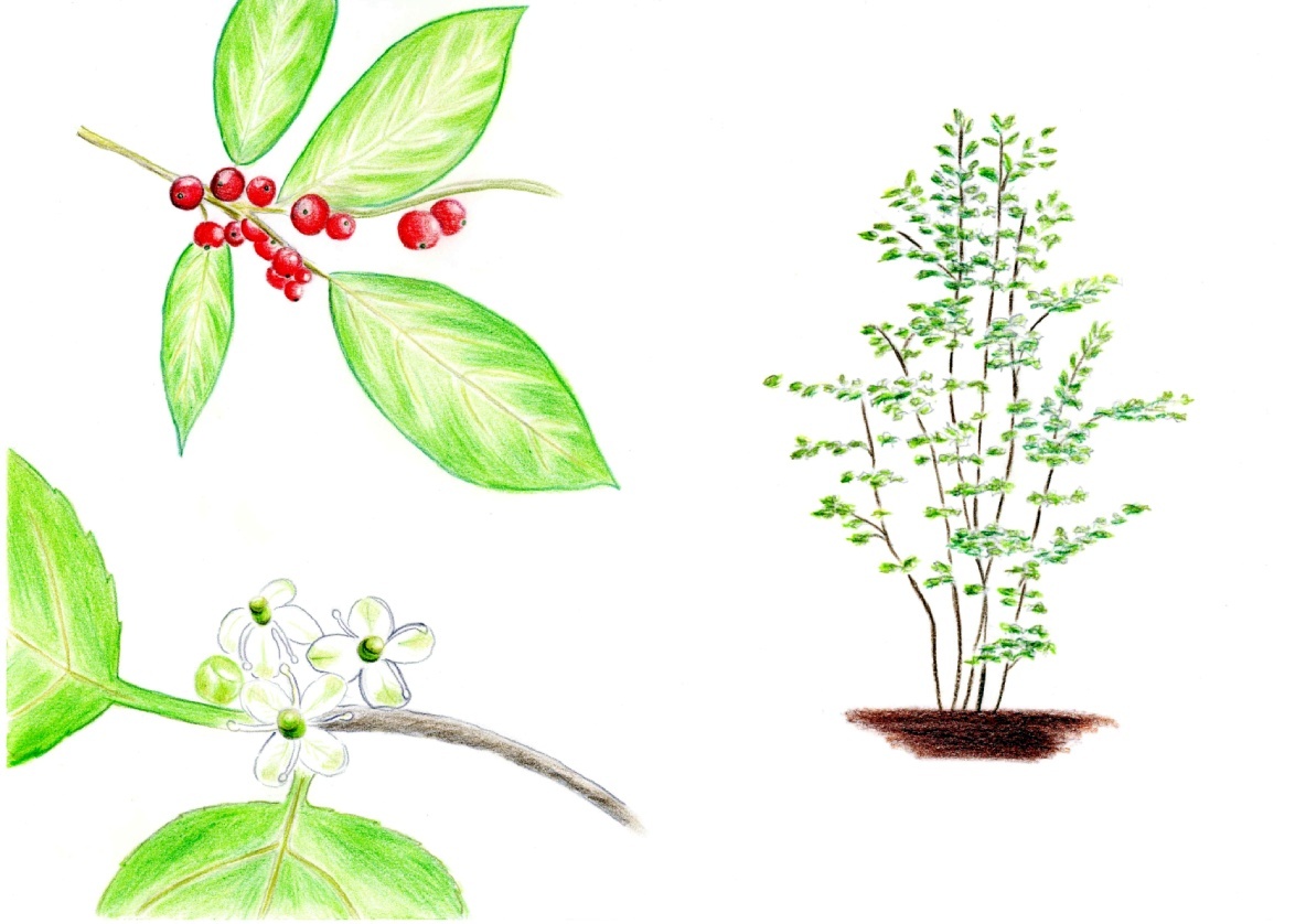 まだ葉が緑色の時期に小粒で真っ赤な実(直径7㎜位)を付ける姿には趣を感じられます。実を楽しみたい場合は雌雄株を植え分ける必要があります。自然樹形を楽しむ樹木ですが、剪定をする場合は不要な枝をとる程度にしたほうが良いです。