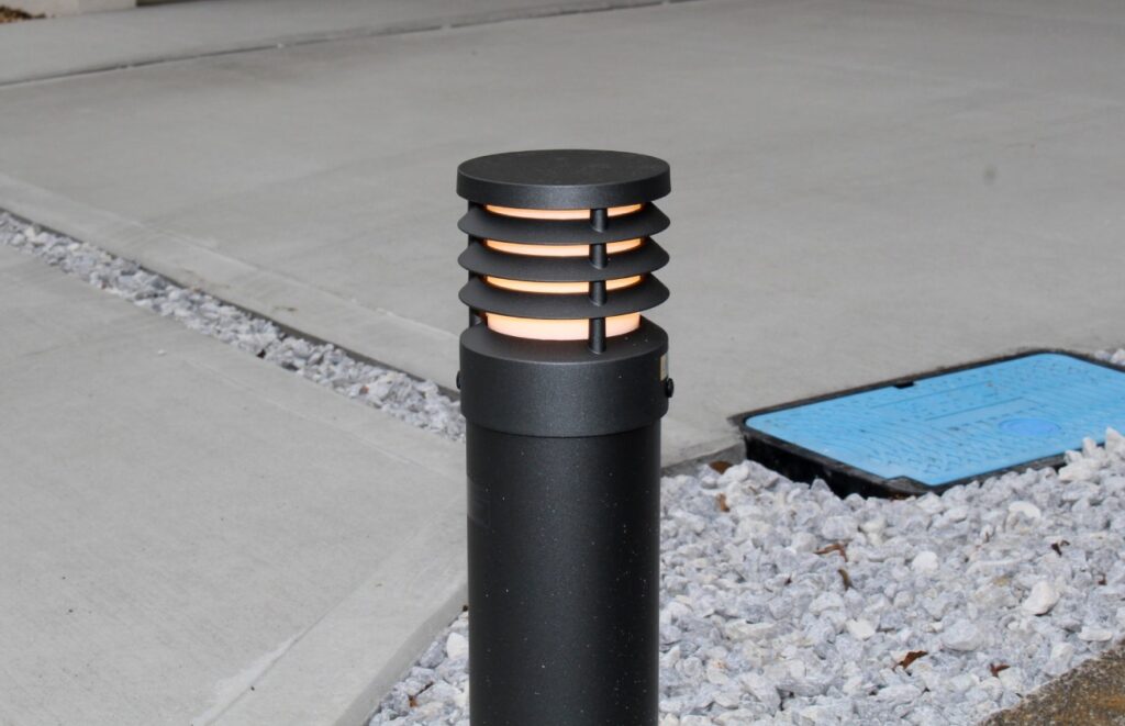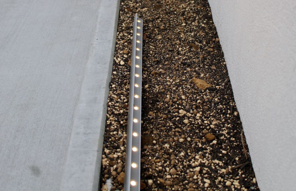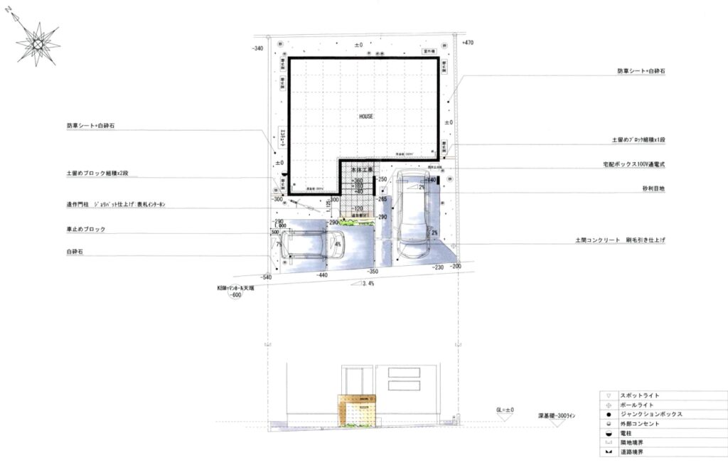 夜間安心して駐車ができるポールライトと、門柱を優しく照らすアンダーバーライト。どちらも明るさセンサー付き電源から発動しているので、自動で点灯しタイマーにより消灯します。(タカショートランスユニット)最近のオープン外構は敷地内空間が丸見えなので、照明演出による防犯が主に役立っています。門柱の足元はお客様のお好みの植木を植えることができます。