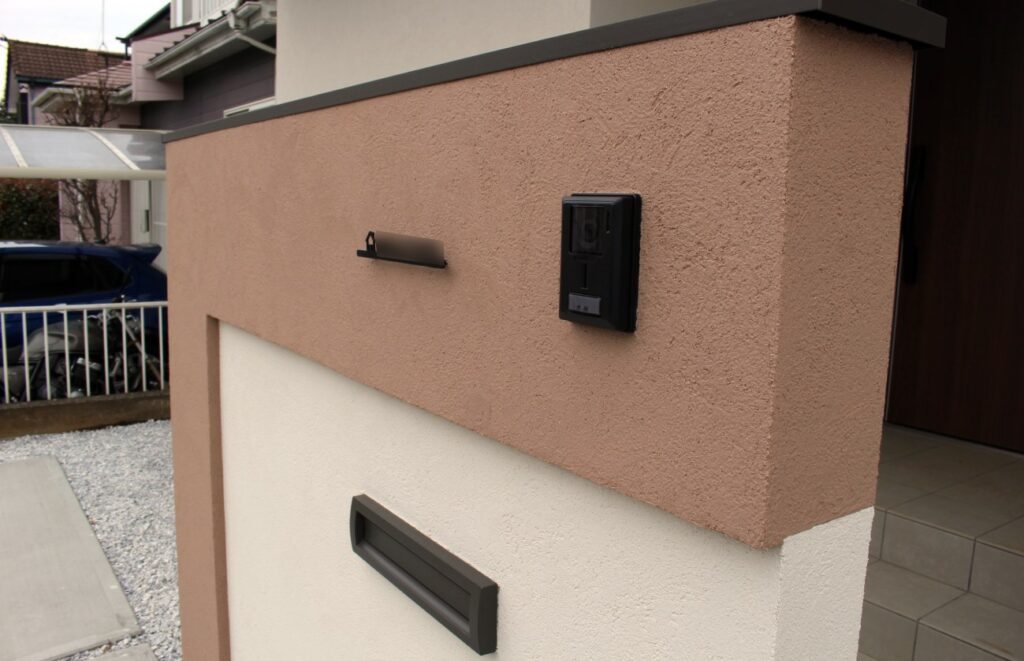 門柱はオリジナル造作門柱で、異なったサイズの下地ブロックを2つ積み上げることで建物の立体感を門柱にも演出しています。ジョリパット割り肌仕上げ・笠木はLIXILのコーピングです。
