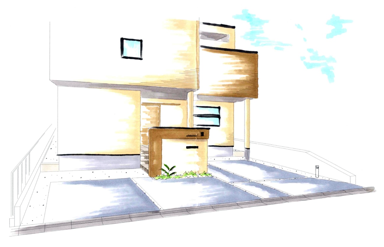 建物のツートンカラーにあわせたエクステリア