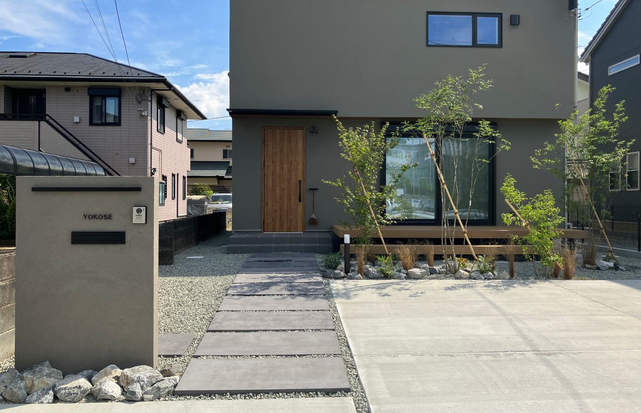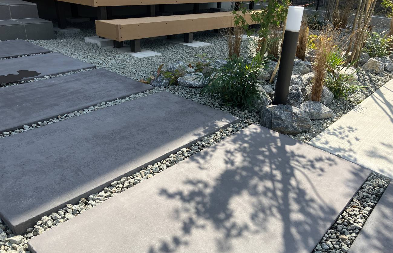 アプローチラインはコンクリート平板が持っている素材を良さを引き立てるためにあえて真っすぐ、それぞれのエリアを組み立てて構成されています。飽きは当然来ません。