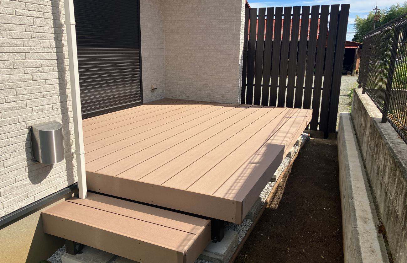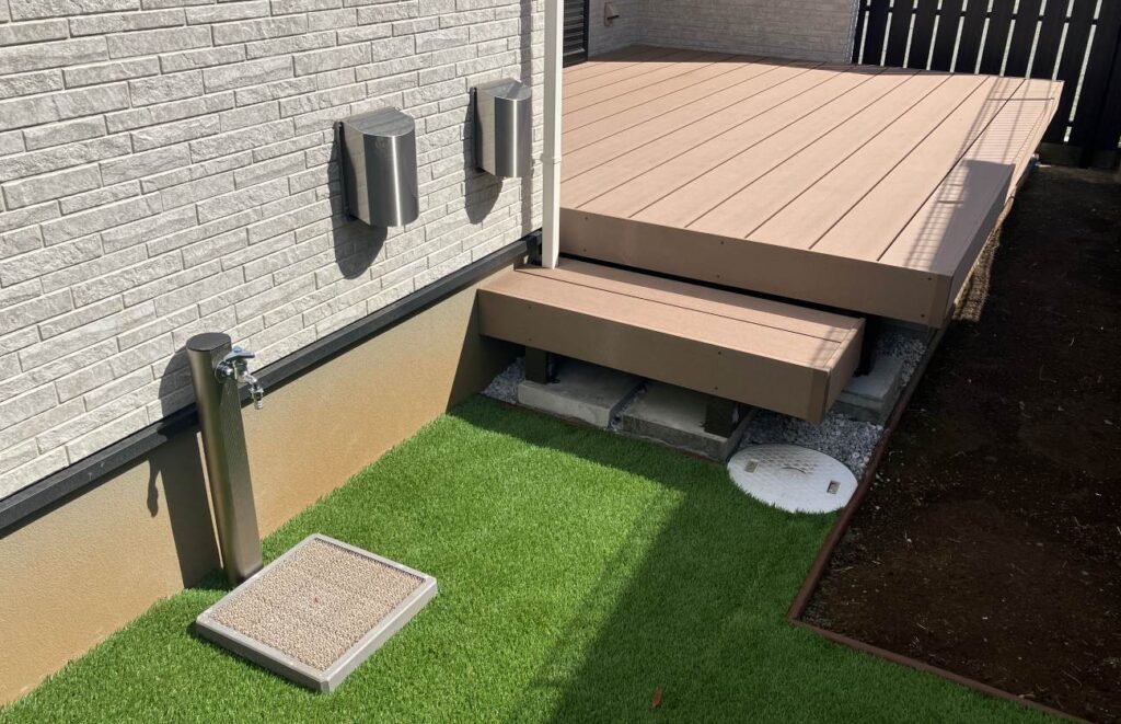 お庭は樹脂製のウッドデッキを使用し、木のささくれや腐食の心配をせずに、毎日優雅なひと時を過ごすことが出来ます。LIXIL:ウッドデッキ樹ら楽ステージ