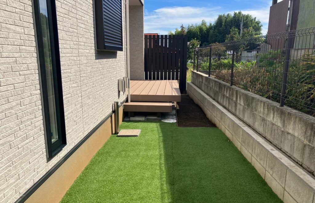 木目入りの目隠しフェンスは縦張りを選択し、外からの目線を軽減する事で生まれた、もう一つの庭空間を存分に味わうことが出来ます。