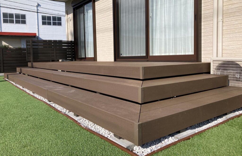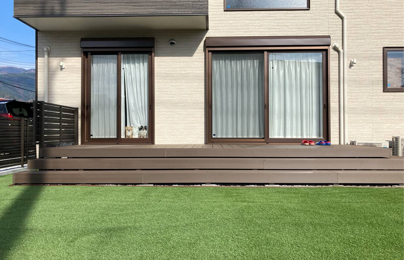 デッキの側面にはゆったりと階段を設け、芝生へのアクセスをより安全に出来るようにしています。