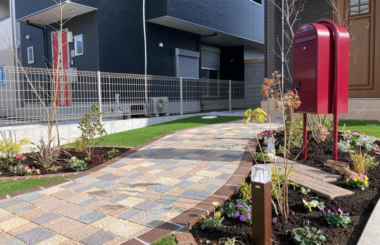 玄関ポーチに続くアプローチはコンクリート製のインターロッキングを使用し鮮やかな舗装面にしています。