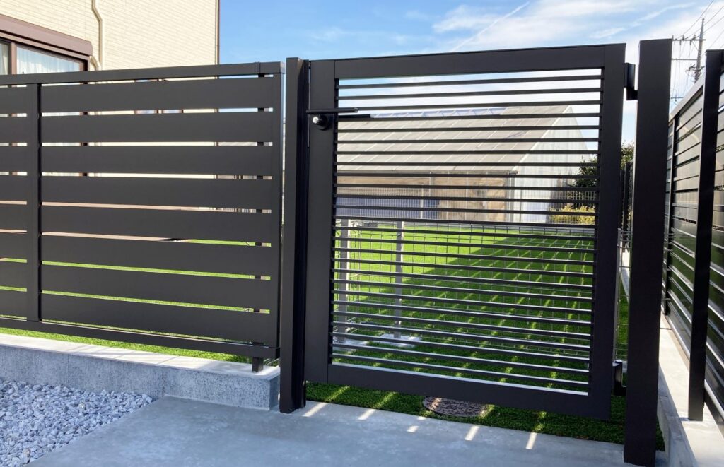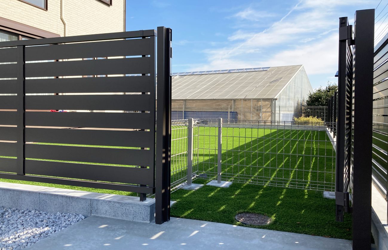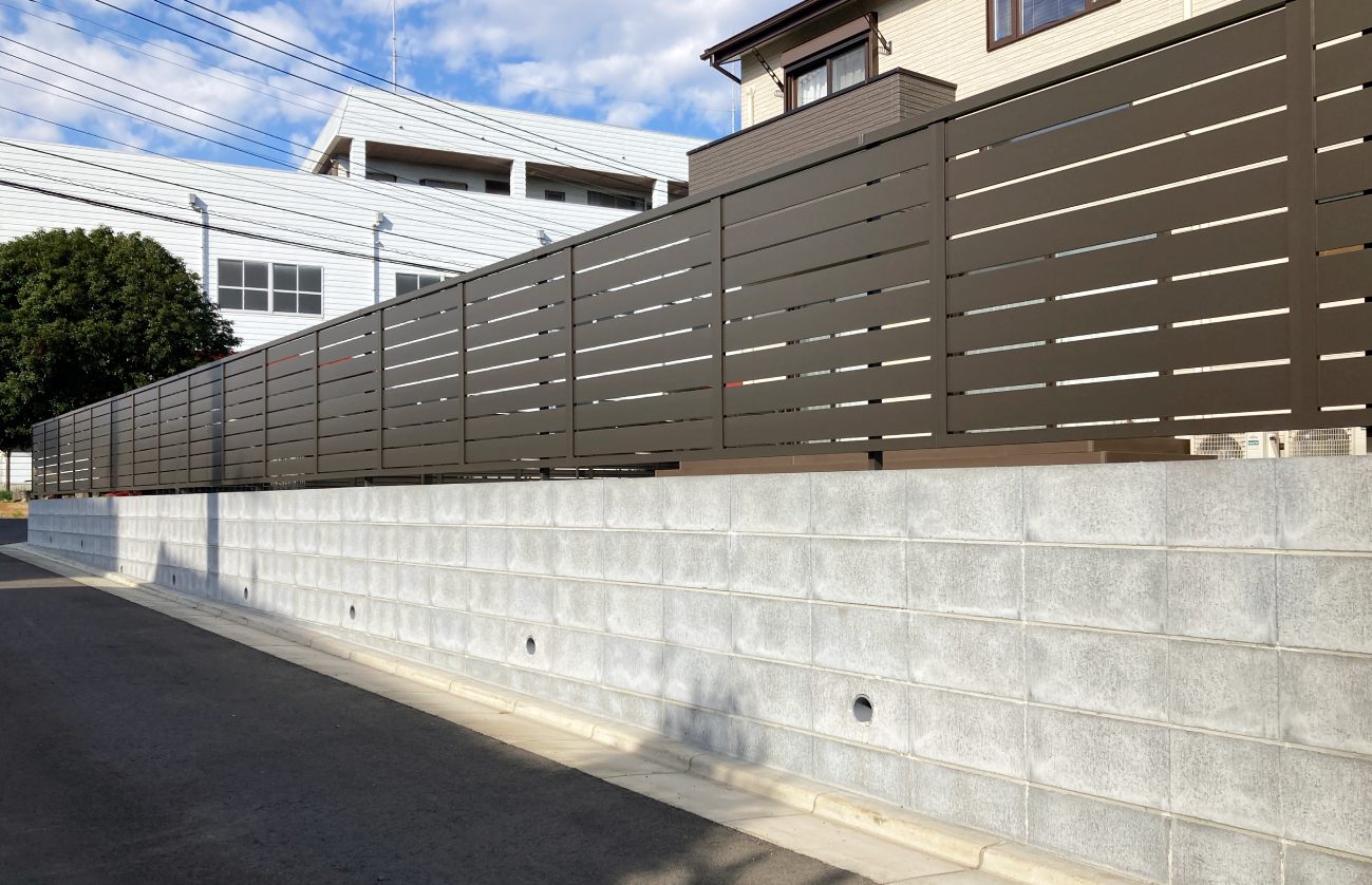 ブラウンのアルミ製フェンスを設置し、目隠し効果を持たせるとともに、エクステリア全体に統一感のあるデザインにまとめています。