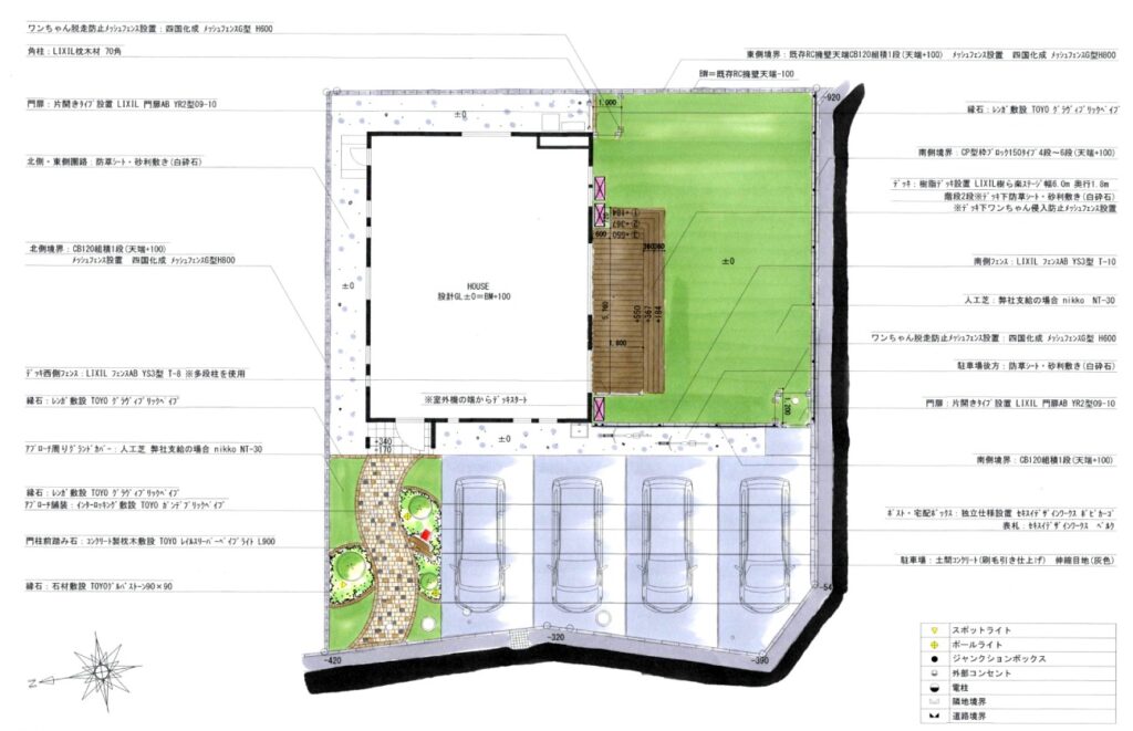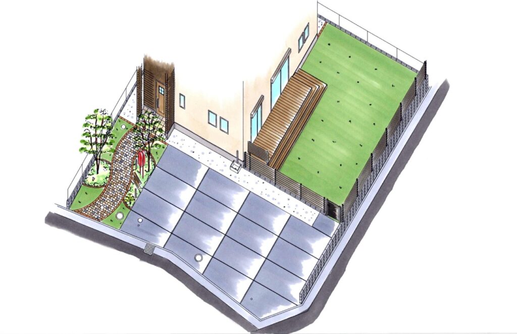 南のメインガーデンには人工芝と人工木のデッキを取り入れ、お施主様とワンちゃん達が楽しめるドックランの空間が広がります。