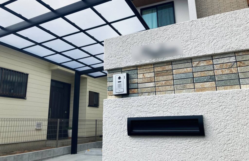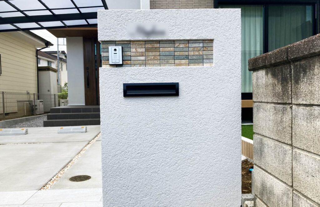 一部に使用したオンリーワン/MOSAIC アルビノクォーツはランダムな石目の模様と凹凸が、フラットな壁面にほどよいアクセント効果をもたらしてくれます。埋込型ポストを設置することで、安全に敷地内から郵便物を取る事が出来ます。