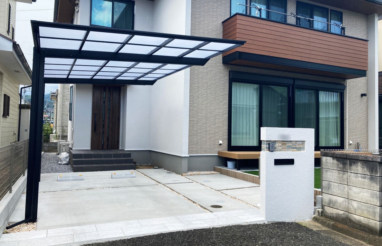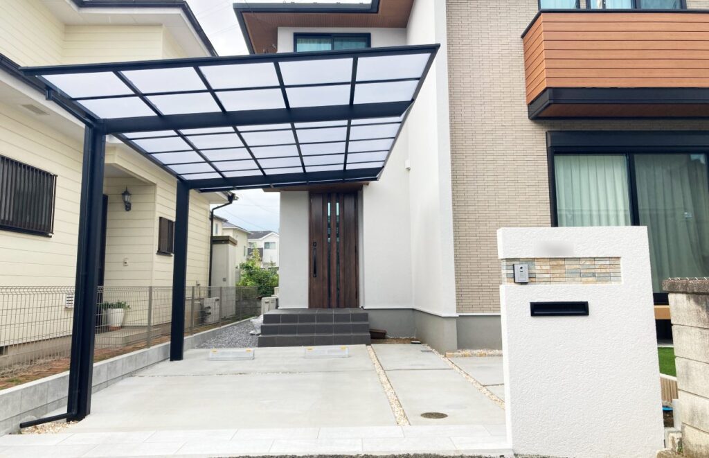 建物のサッシと同じブラックのカーポートにすることで、穏やかなデザインの中にもほどよく、カッコいい印象を与えてくれます。