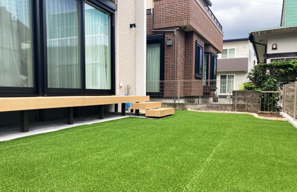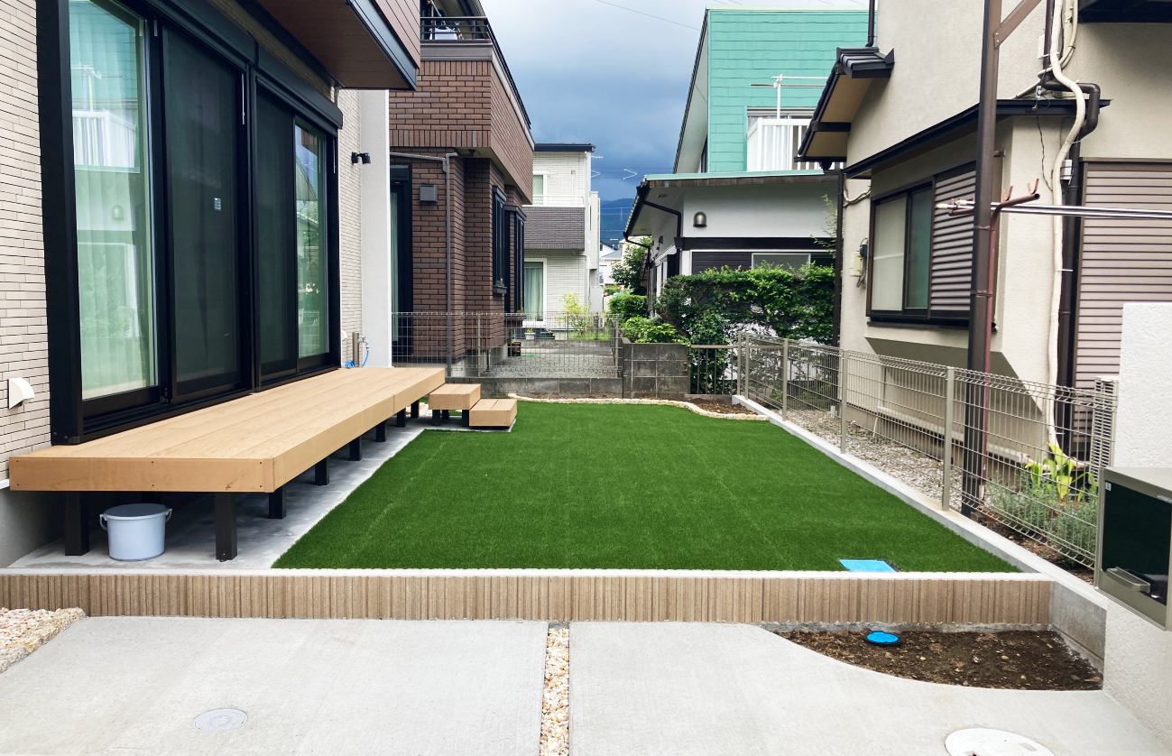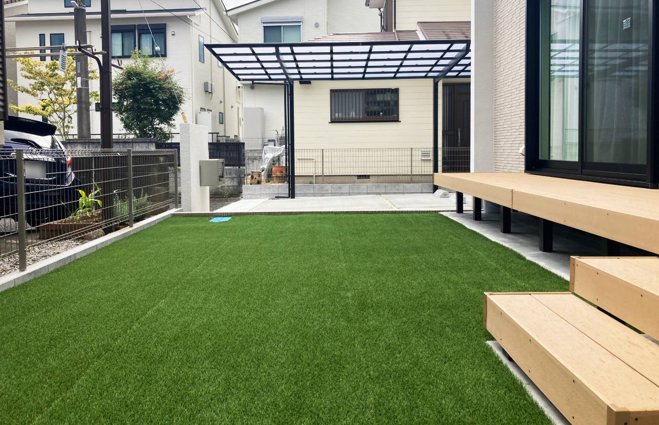 人工芝を一面に敷き、お子様が裸足でも歩ける広々としたお庭空間になっています。人工芝の下には防草シートも入れることで、防草対策も期待出来ます。