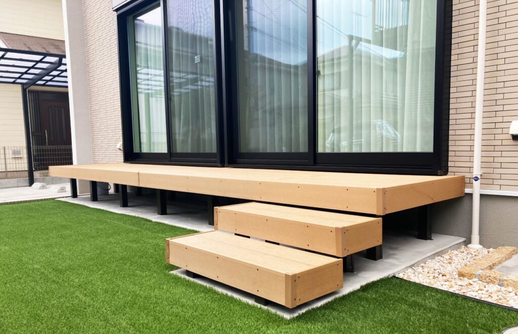 掃き出し窓の前にはLIXIL/樹ら楽ステージを採用し、お部屋の中からお庭への行き来をしやすいように階段を設けました。
