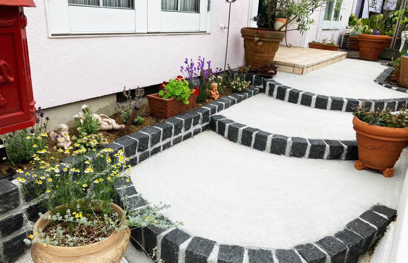 舗装面のコンクリート表面は刷毛引きにし、雨の日や水を撒いた後のスリップ防止効果を持たせています。曲線と花壇のピンコロ石はブラックの色を採用し、落ち着きと重厚感のあるデザインにまとまっています。コンクリート素材だけではなく天然石を取り入れた花壇はアプローチに華やかな印象を与えてくれます。