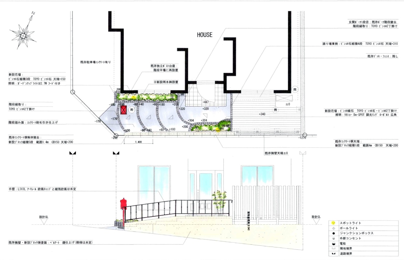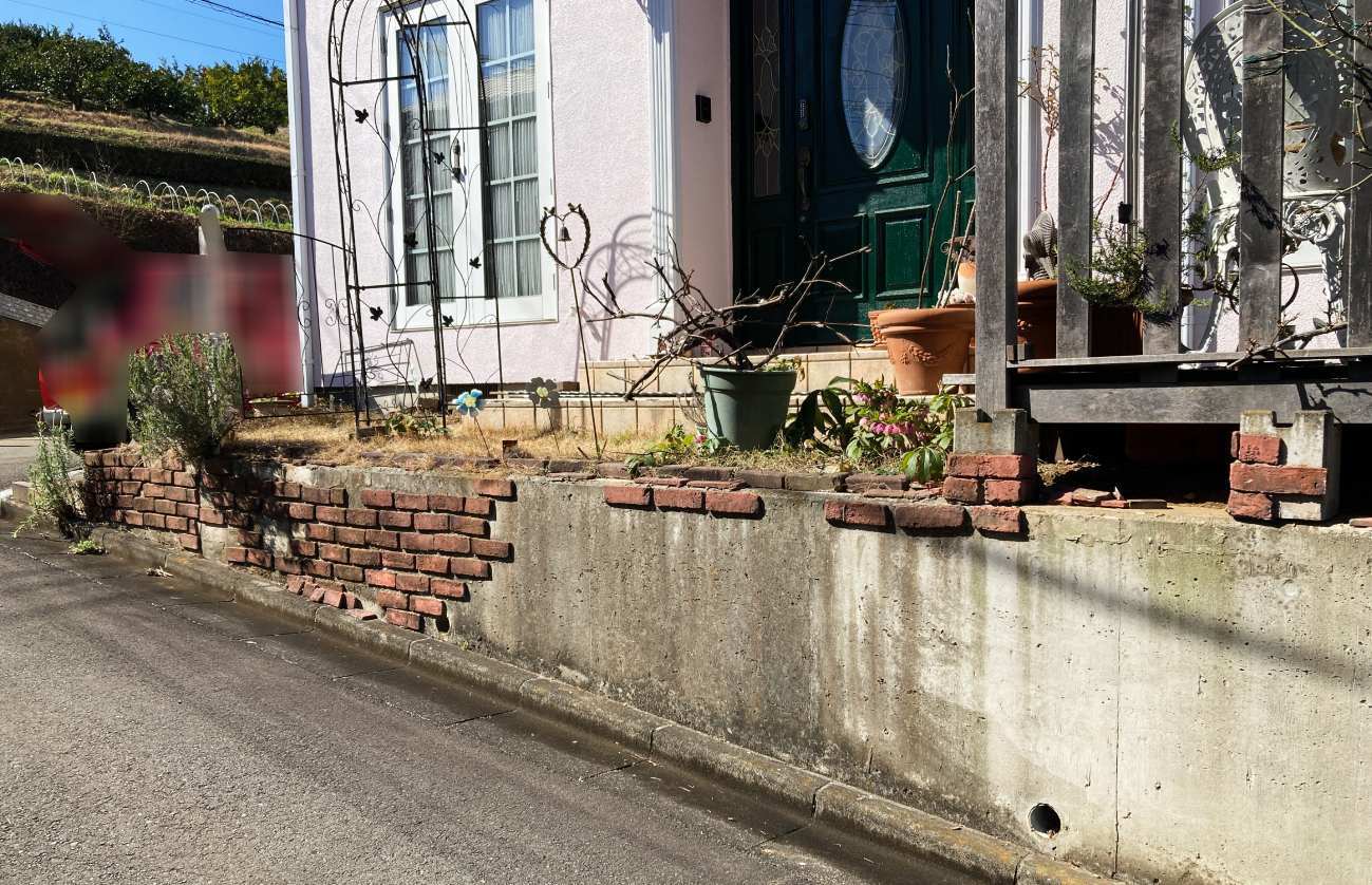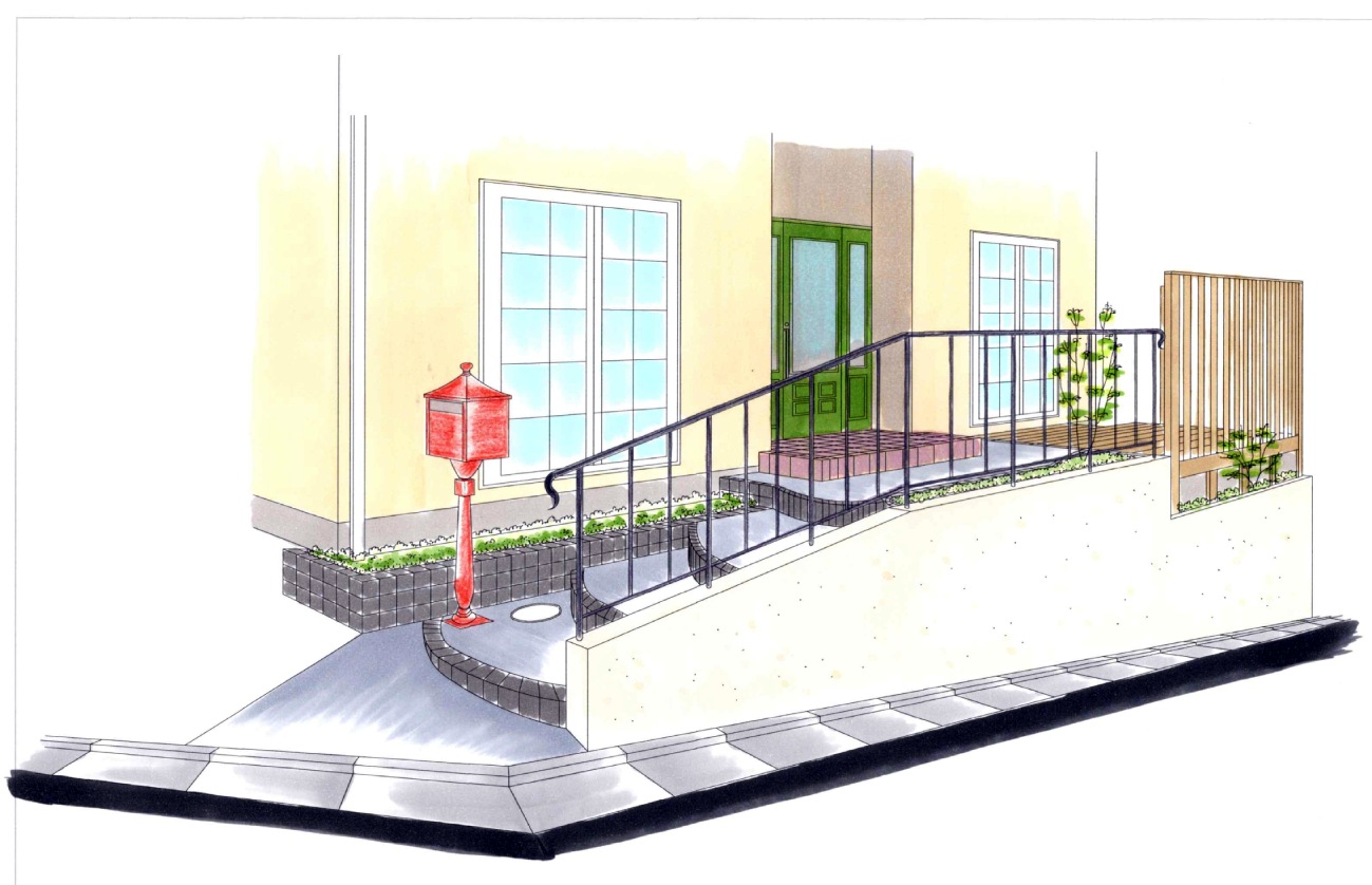 道路からの高低差があり、玄関までのアプローチがやや不安定だった為、安全にゆったりとした舗装面を作る必要がありました。道路境界は転落防草対策と歩行補助対策としての手摺の設置が必要でした。