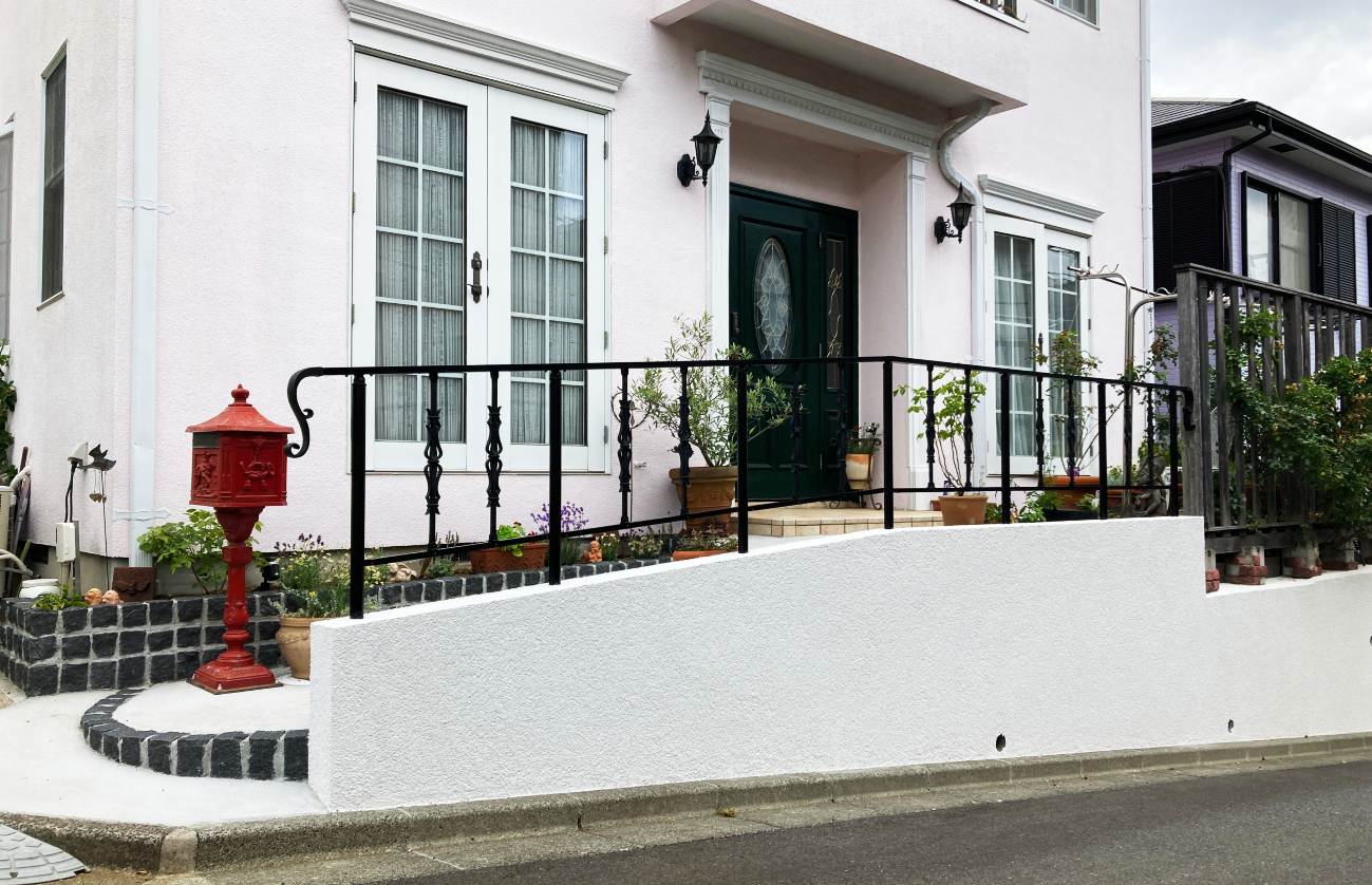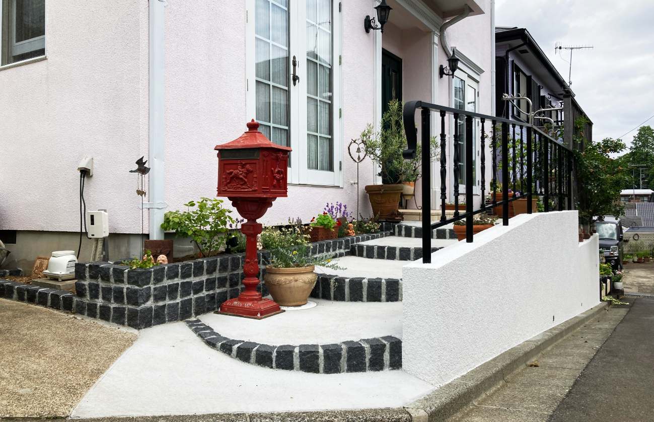 当初の外構よりも多く階段を設け、各段の段差を緩やかにしました。清潔感のある壁面とフェンスを設置し高低差の不安を解消しました。