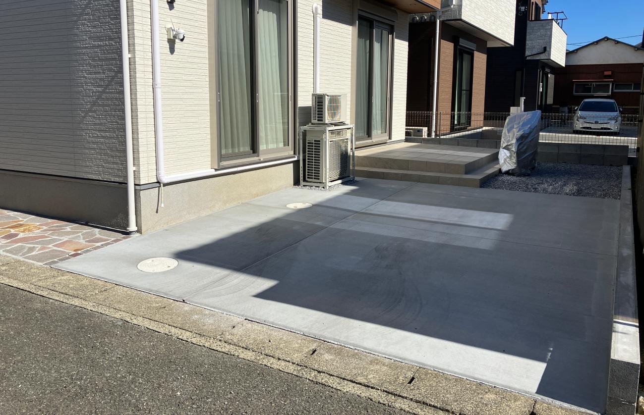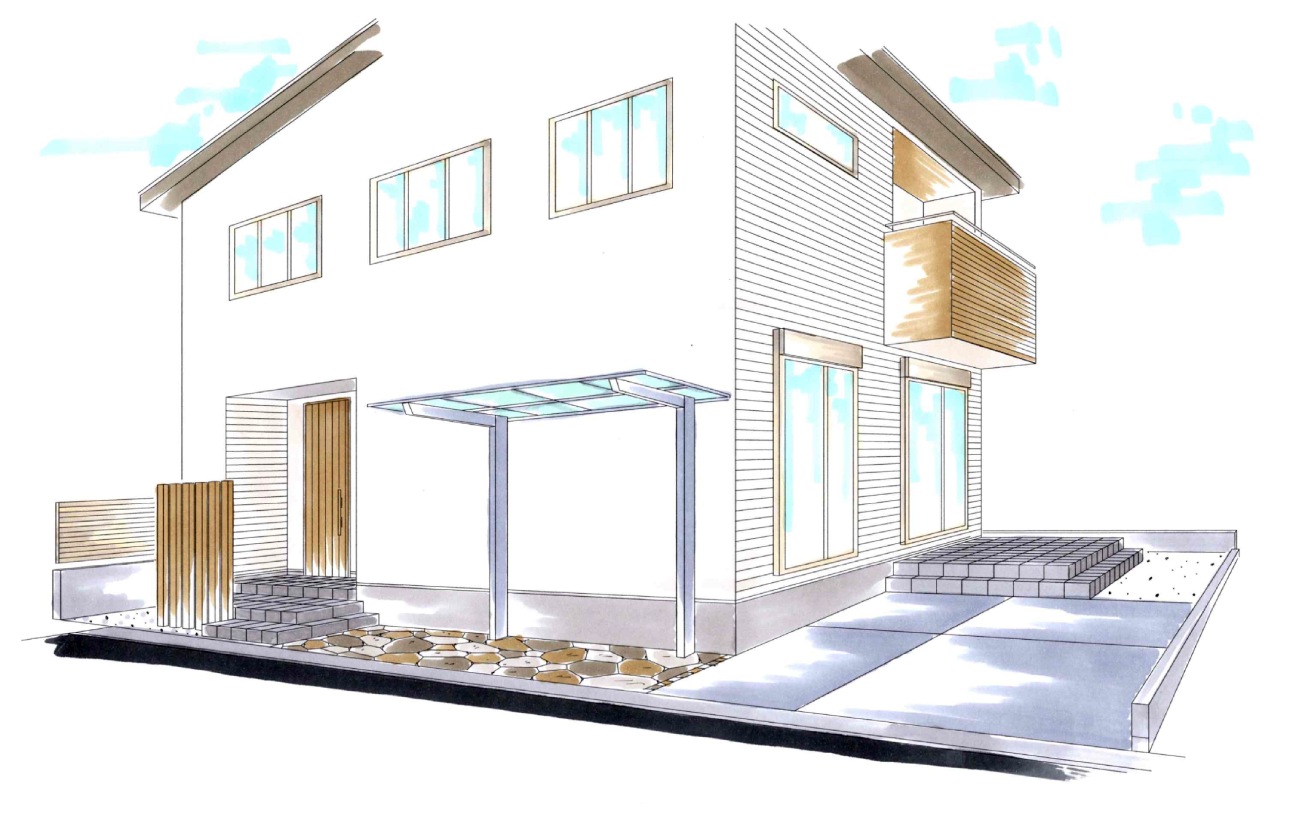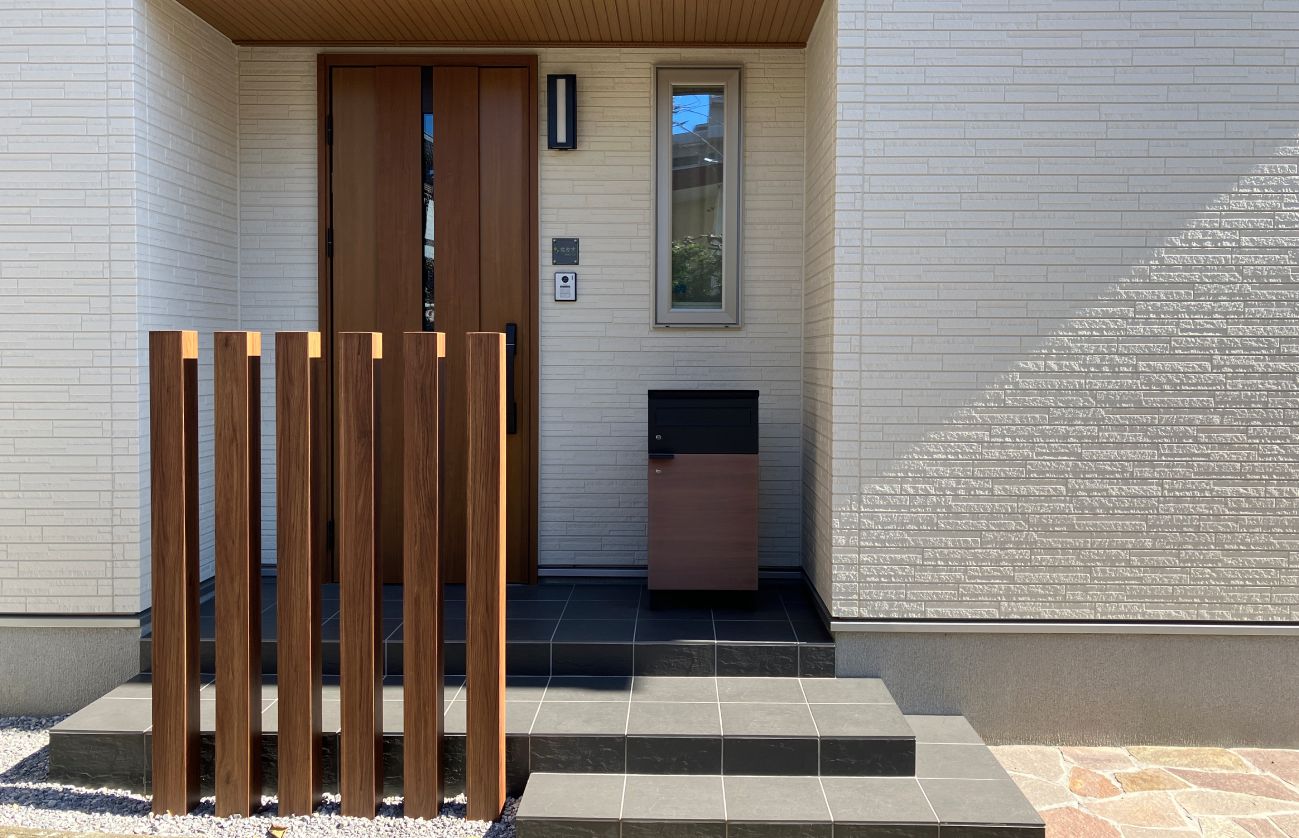 玄関ドアと同色のアルミ枕木材を設置し、緩やかな蹴上の階段を主導線方向へ広げることでストレスのない馴染みのあるアプローチを演出しております。