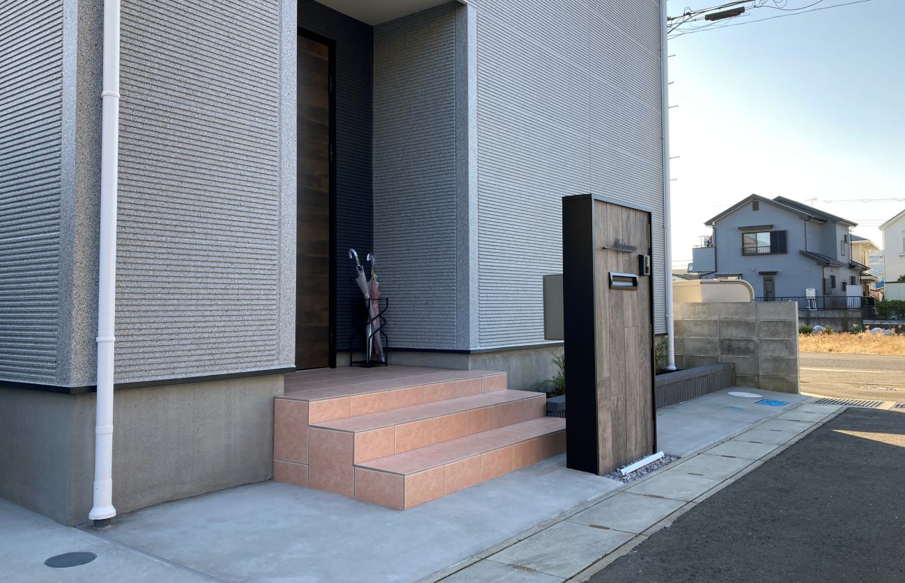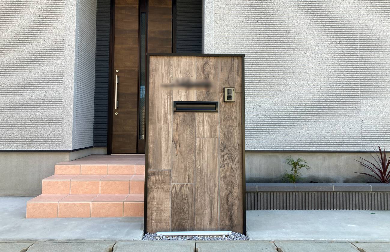門柱の美しい木目タイルをなるべく隠してしまわないよう、埋込タイプのポストを使用しています。