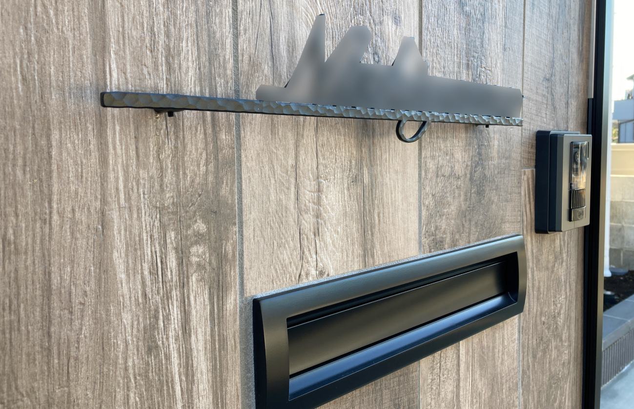 表札はやや大き目の横文字表札を使用しています。ロートアイアンのマットなブラックが落ち着きのある上品なデザインです。