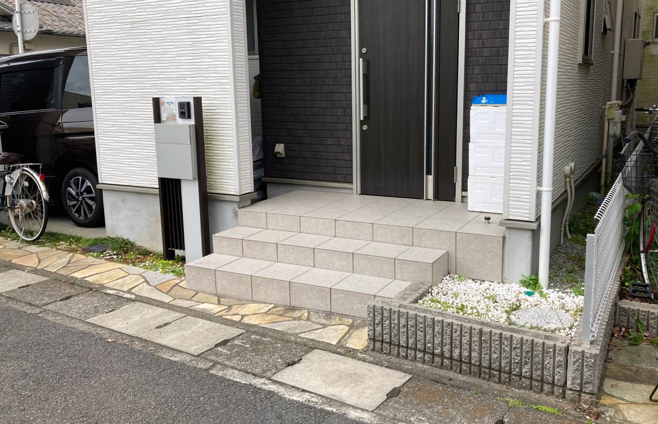 リノベーション後は既存の石貼りに馴染む、ブラジル産の乱形石を敷き詰め、中途半端な植栽帯を清潔感ある舗装に変えました。