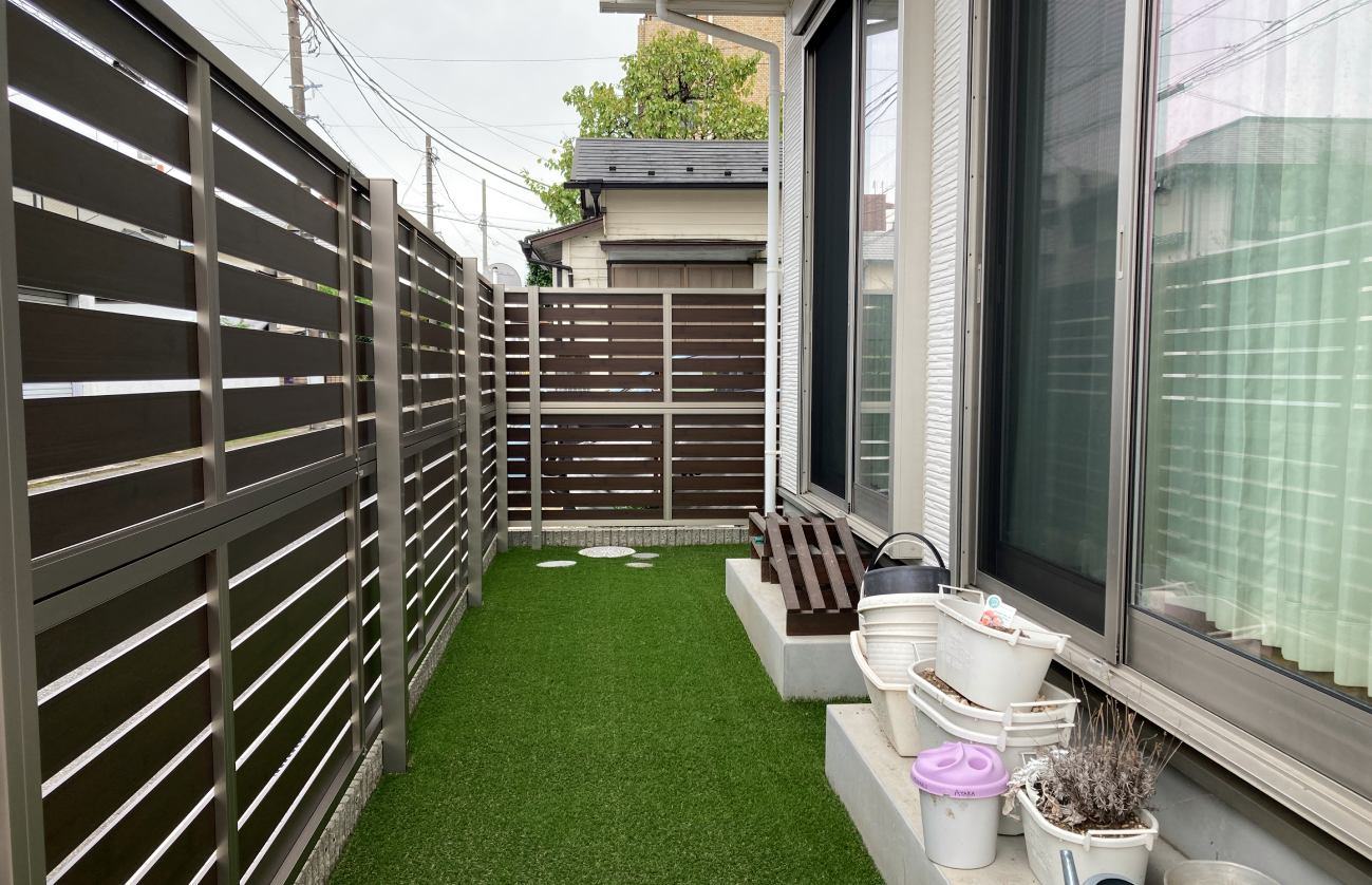 当初は、掃き出し窓の前にだけに目隠し格子が設置されていましたが、目線が気になり気軽にお庭に出られない状態でした。