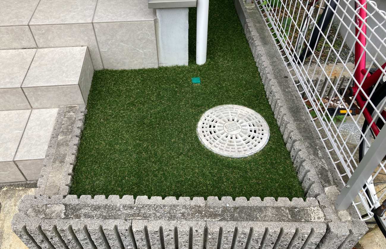 天然芝は全て人工芝に張替え、メンテナンスのしやすいお庭空間へと変わりました。下地には砕石・防草シートを使用しており、防草対策もしつつ水はけの良い舗装面になっています。