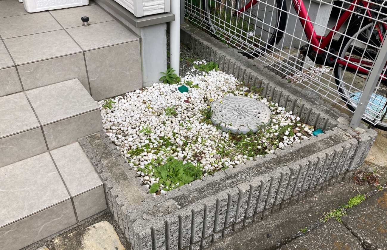 玄関横の化粧砂利スペースは防草シートが敷かれておらず、雑草が生えてきてしまう状態でした。