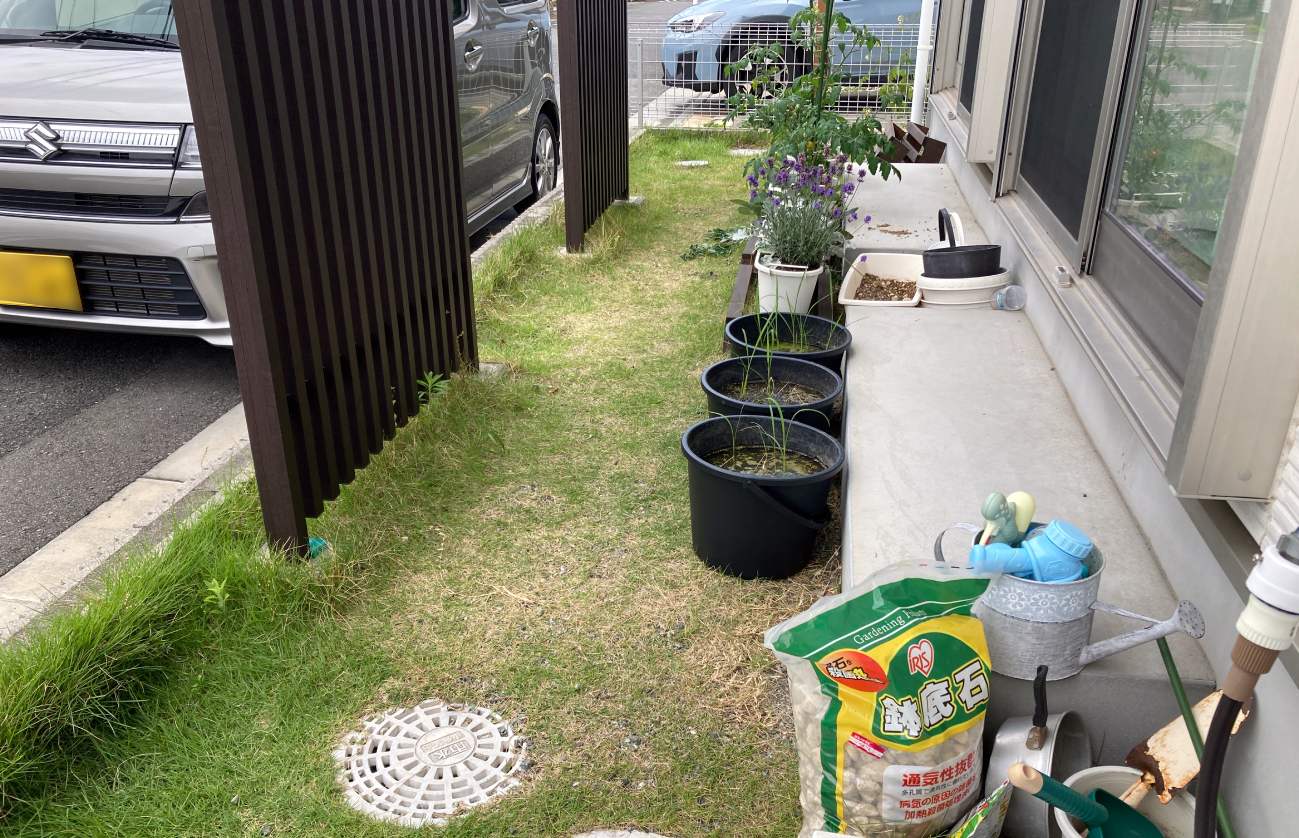 当初は庭の地面に天然芝が敷かれていましたが、メンテナンスがしにくく、一部では枯れている箇所も見受けられました。