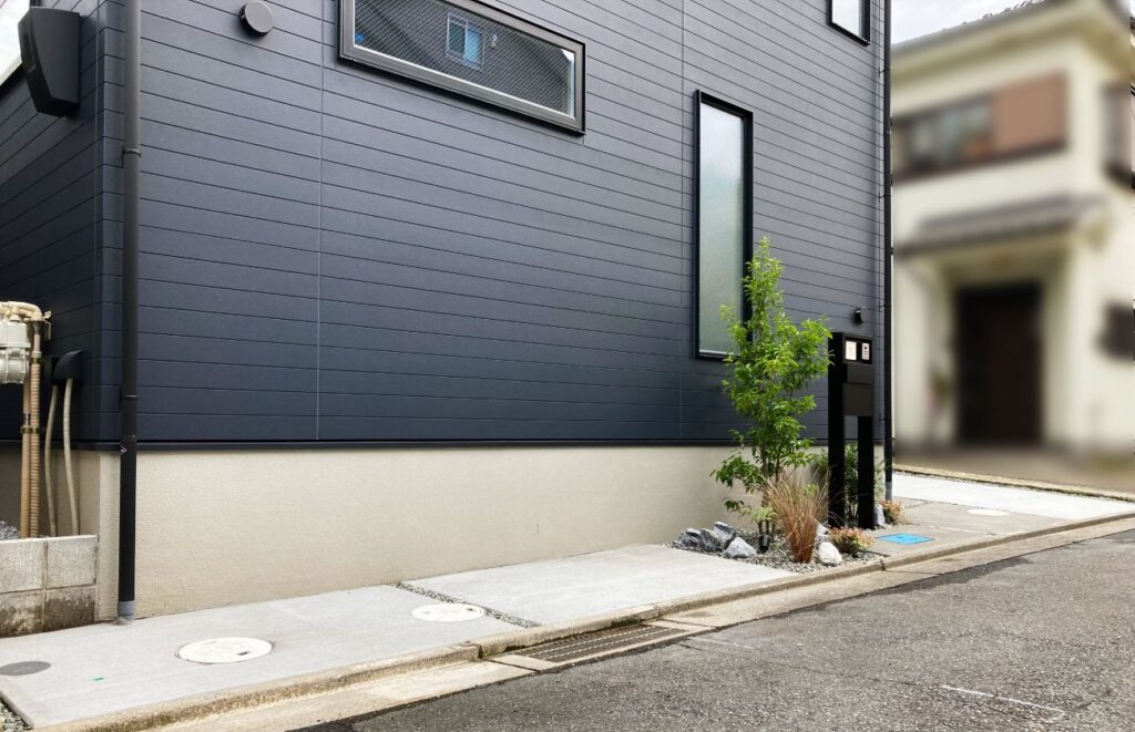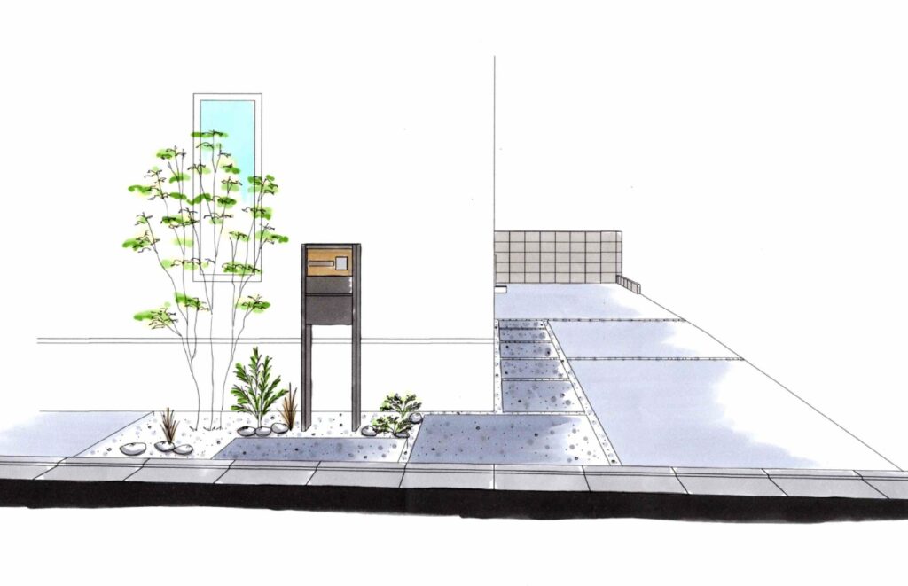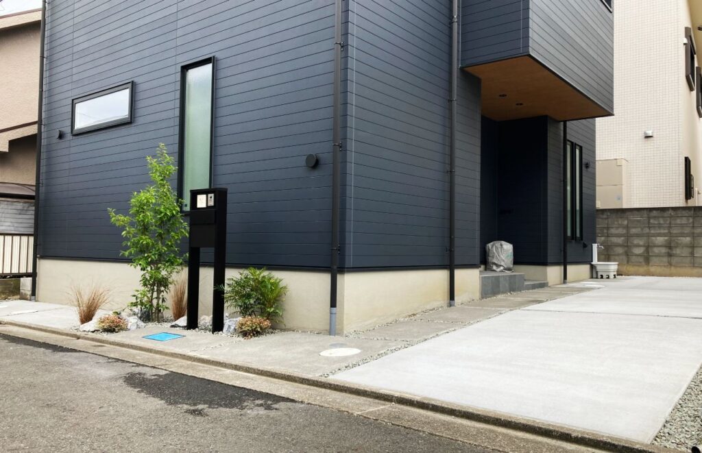 メインのコンクリート駐車場は2台分確保し、人が歩く箇所には洗い出し仕上げを施しています。門まわりには程よく植栽を取り入れることで、全体的に無機質にならないデザインです。