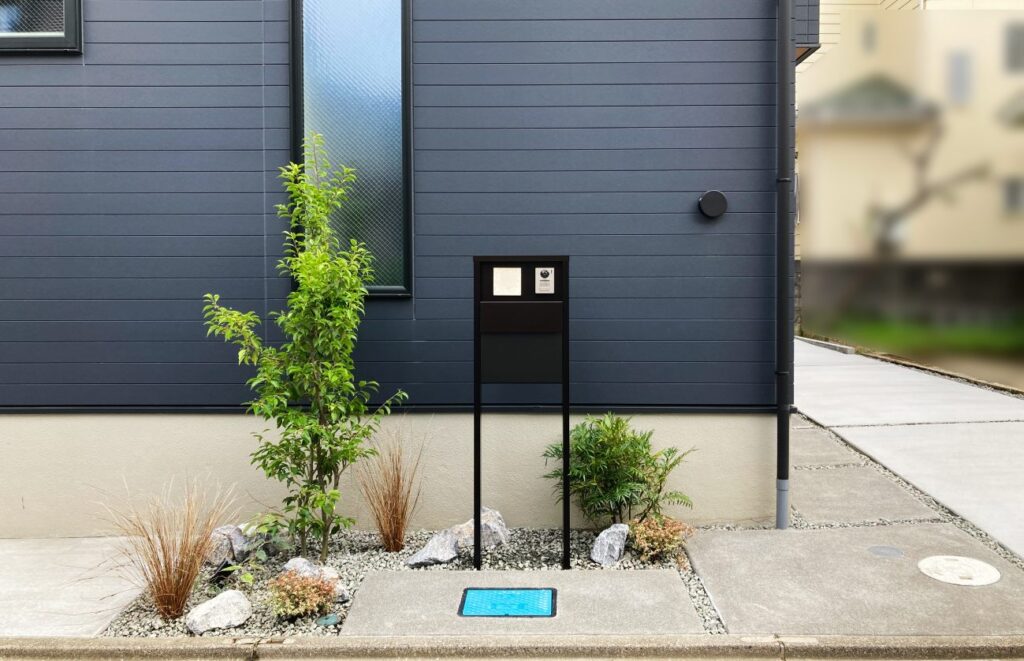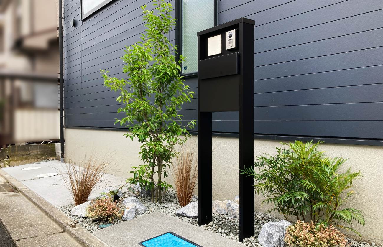 建物のサッシ素材に合わせたブラックの機能門柱は構造物全体に統一感をもたらしてくれます。ダーク系の色味だけだと重くなりがちな空間もシンボルツリーと下草を添えることで一気にお洒落な印象にまとまります。