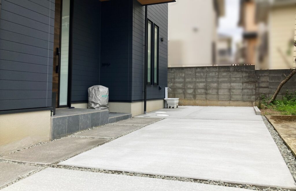 道路に面した狭小箇所はコンクリート舗装にすることで自転車の出しいれをスムーズに