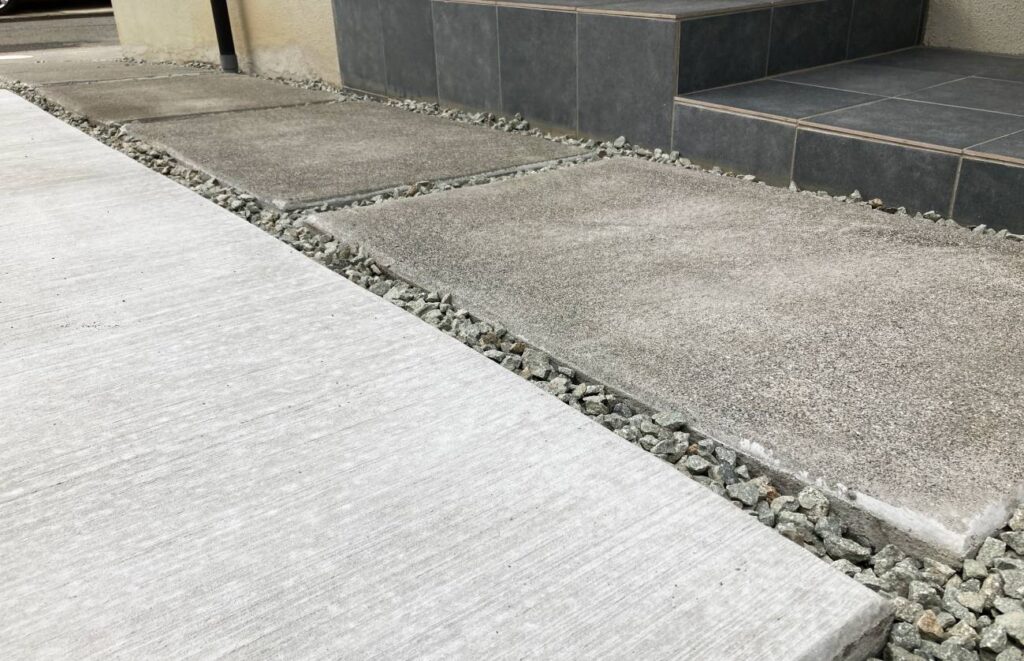 洗い出し仕上げは全面的に落ち着いた色味になるので、コンクリート舗装との色の差や、砂利との境のエッジが強調されアクセント効果をもたらしてくれます。