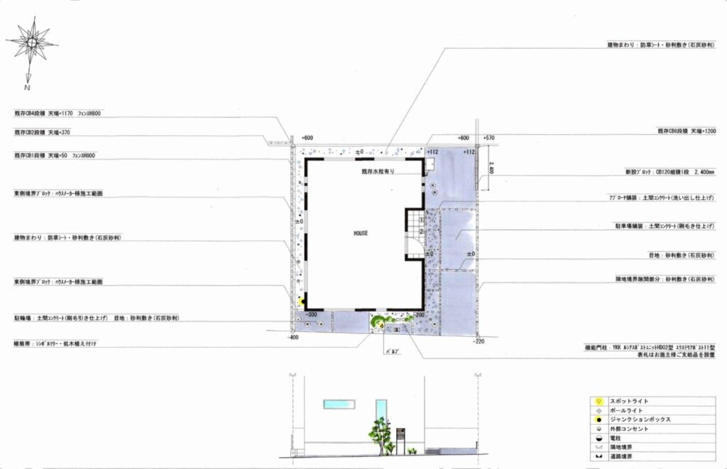 道路からやや高低差がある敷地では緩やかな傾斜を設けて玄関までのアクセスを安全に行えるようにします。