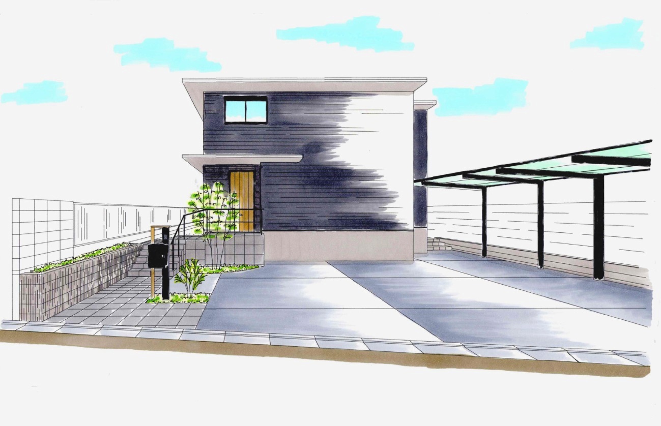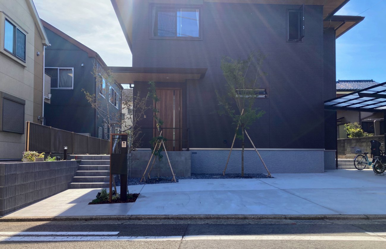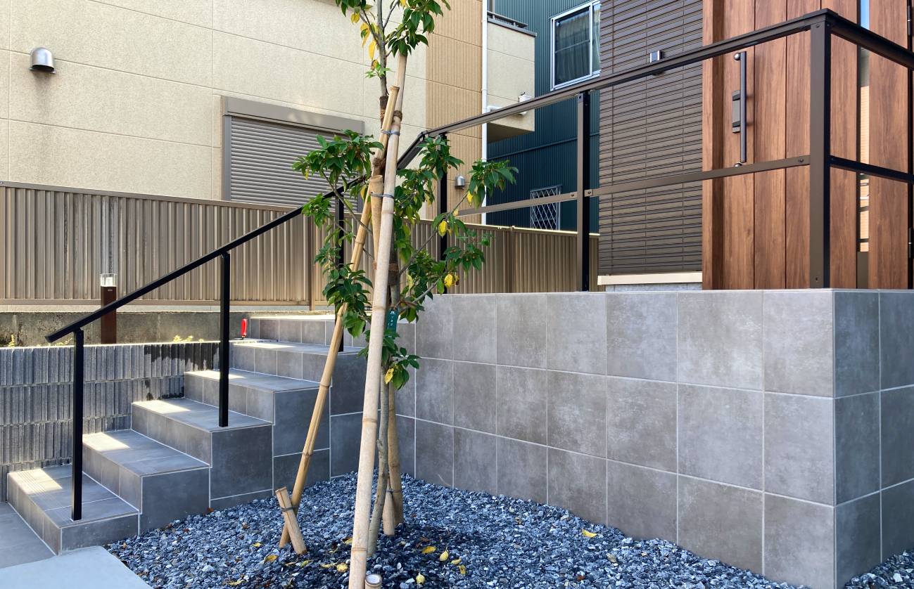 舗装材はグレー系のタイル、コンクリート、化粧ブロックにはダークグレーの配色を取り入れ、全体的に落ち着いた配色にしています。建物のサッシのブラックや軒の木目要素も活かせるよう機能門柱にはブラックと木目のツートーンカラーが美しいYKKルシアスポストユニットHD01型を採用しています。