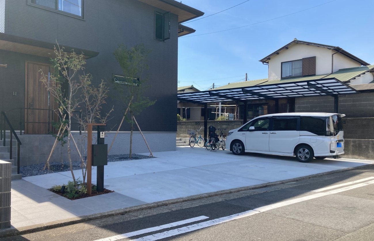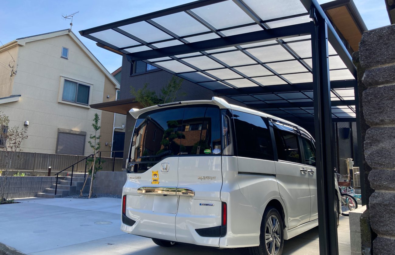 三協アルミのセルフィの奥行2連棟タイプを採用しています。1台のカーポートの下に車と自転車が停められるようにサイズを選定しています。