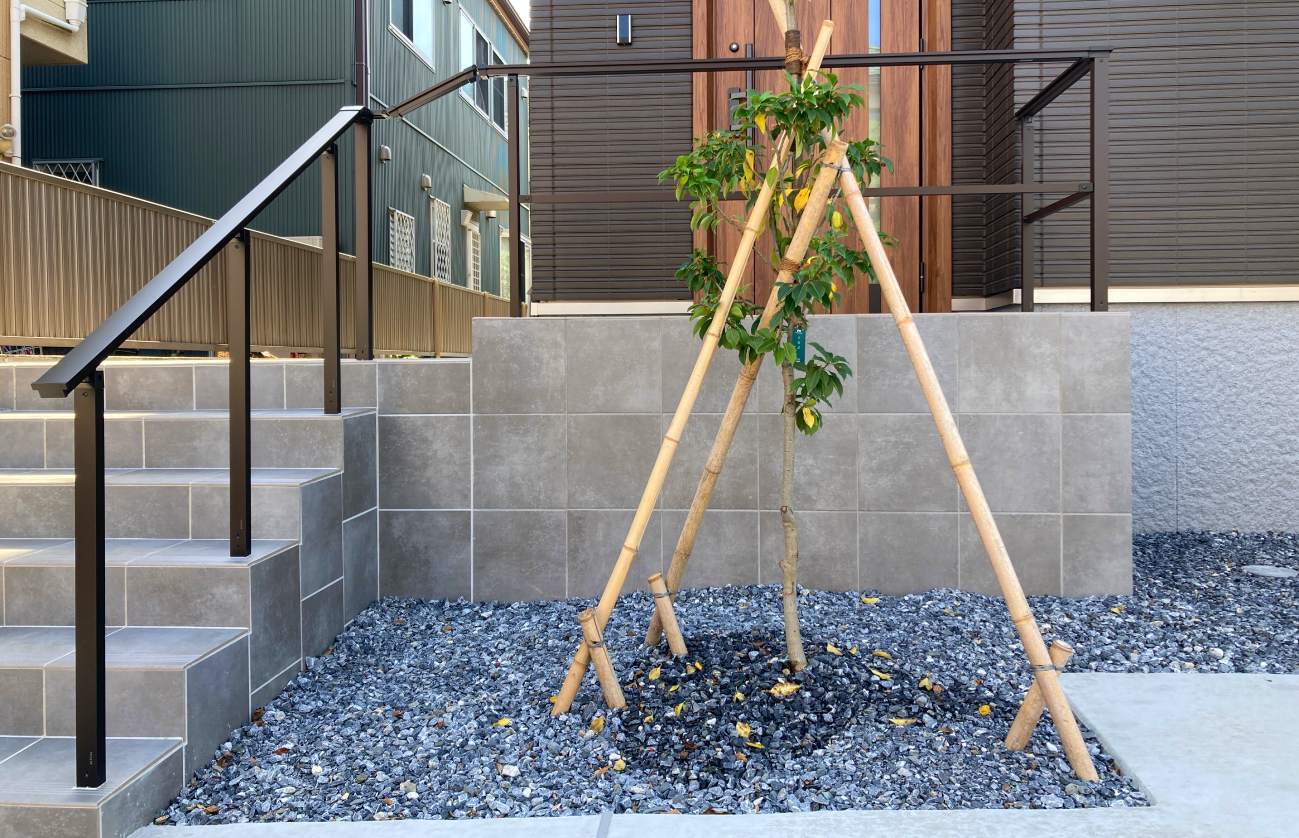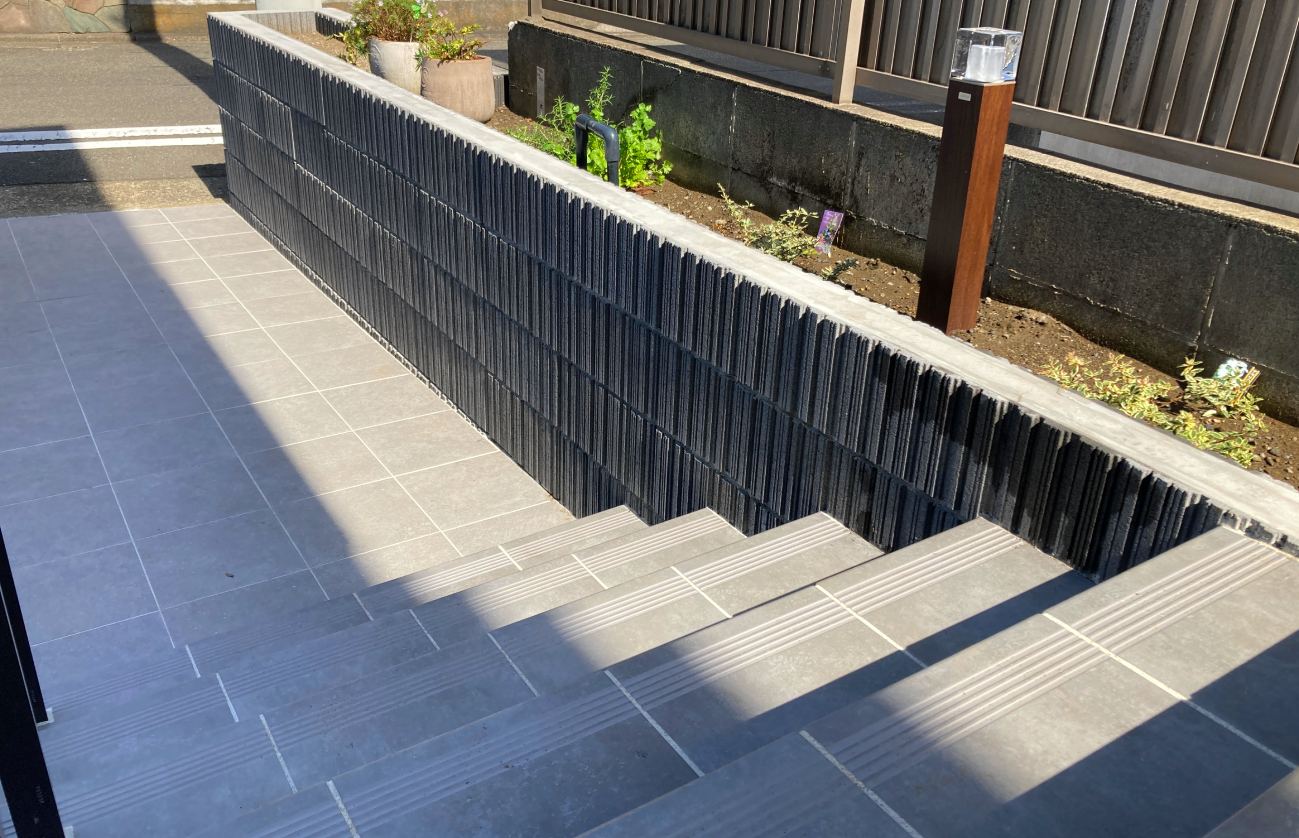 玄関ポーチから下には階段を作成しています。玄関ポーチ部分は特に高低差があり、お子様の転落の恐れがある為、安心して使えるよう横桟を設置しました。