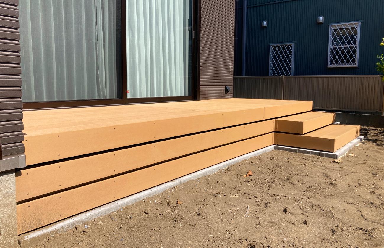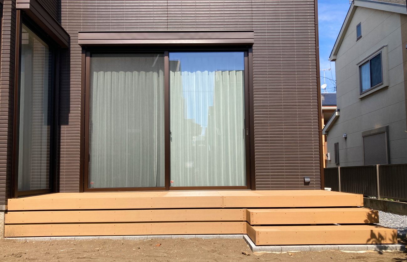 デッキ材にはLIXIL樹ら楽ステージを採用しています。多段幕板にすることで、デッキ下の空間を見せることなく、すっきりとしたデザインになります。