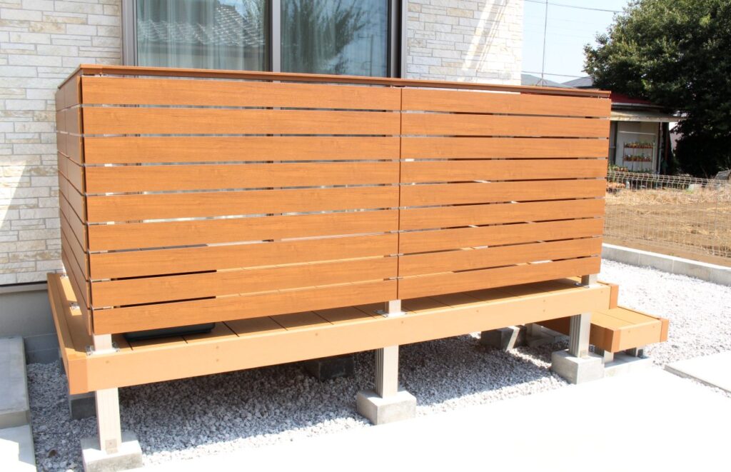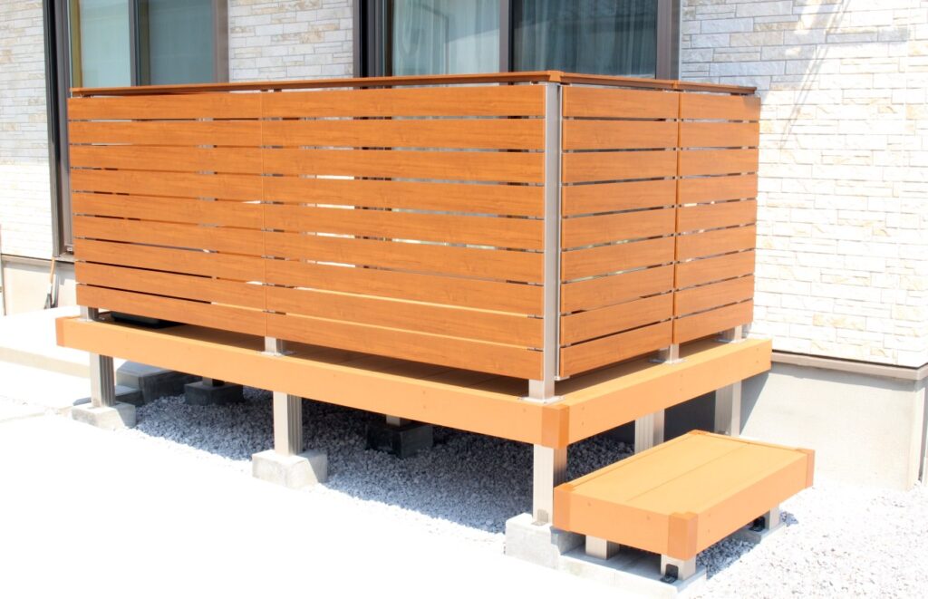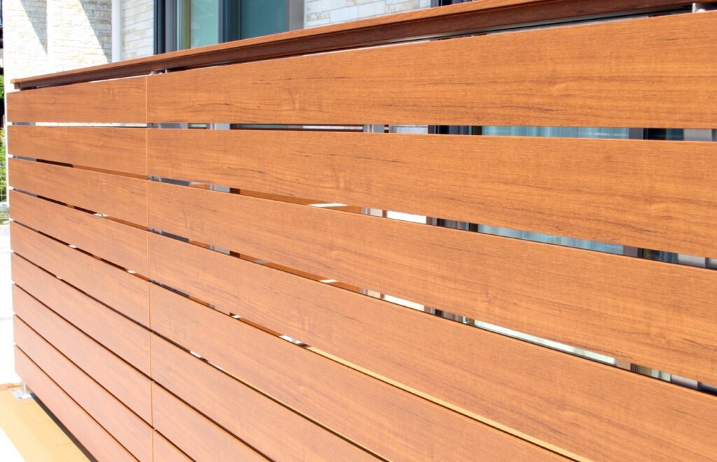 木目のフェンス付ウッドデッキは主に洗濯物を干すスペースとしてご利用いただけます。デッキ材は人工木、フェンスはアルミ製ですが木目のテクスチャーが入っておりリアルな表情を持っています。