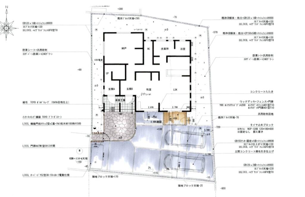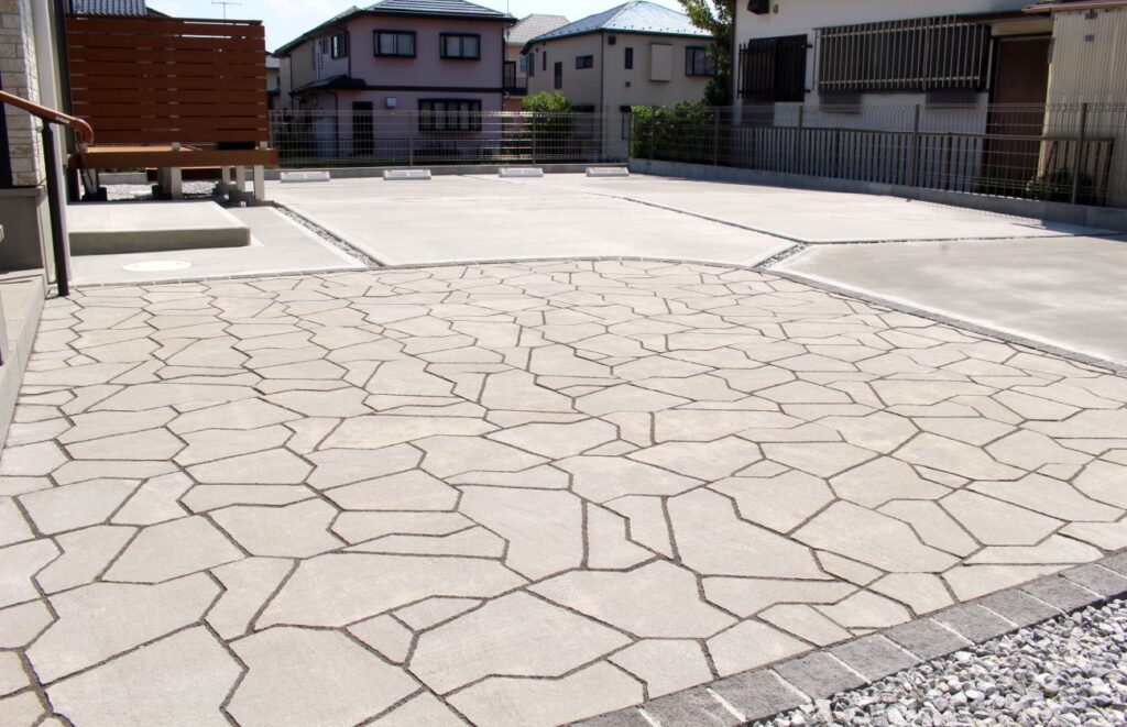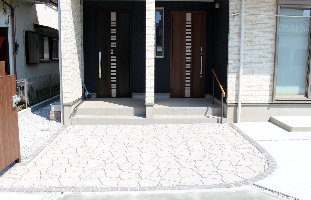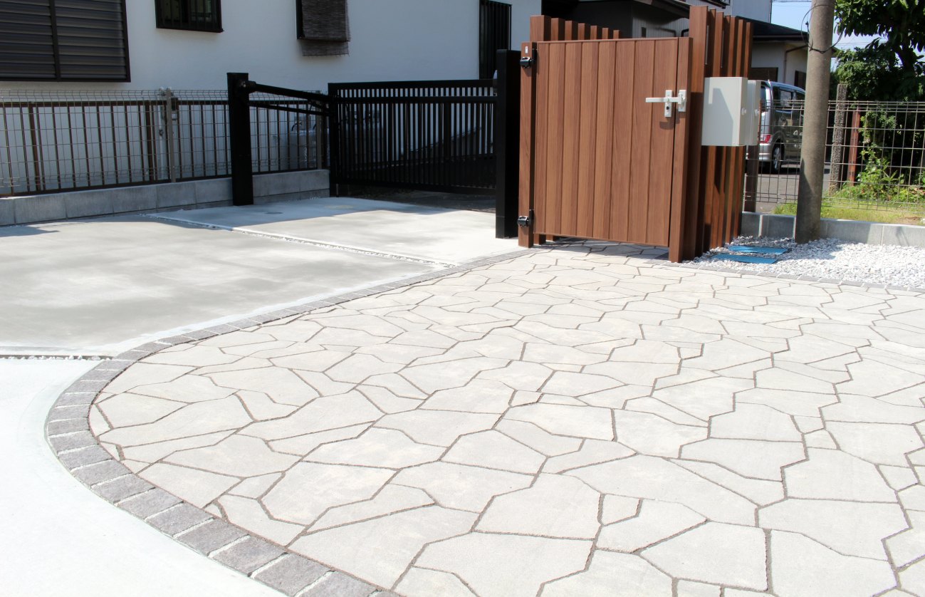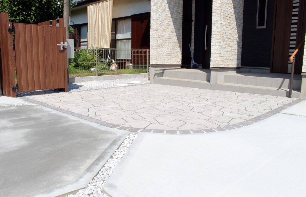 アプローチはインターロッキング材を用いており、まるで自然石の目地のような演出が施されています。こちらのインターロッキング材は透水性にも優れているので水たまりも起きにくい素材です。