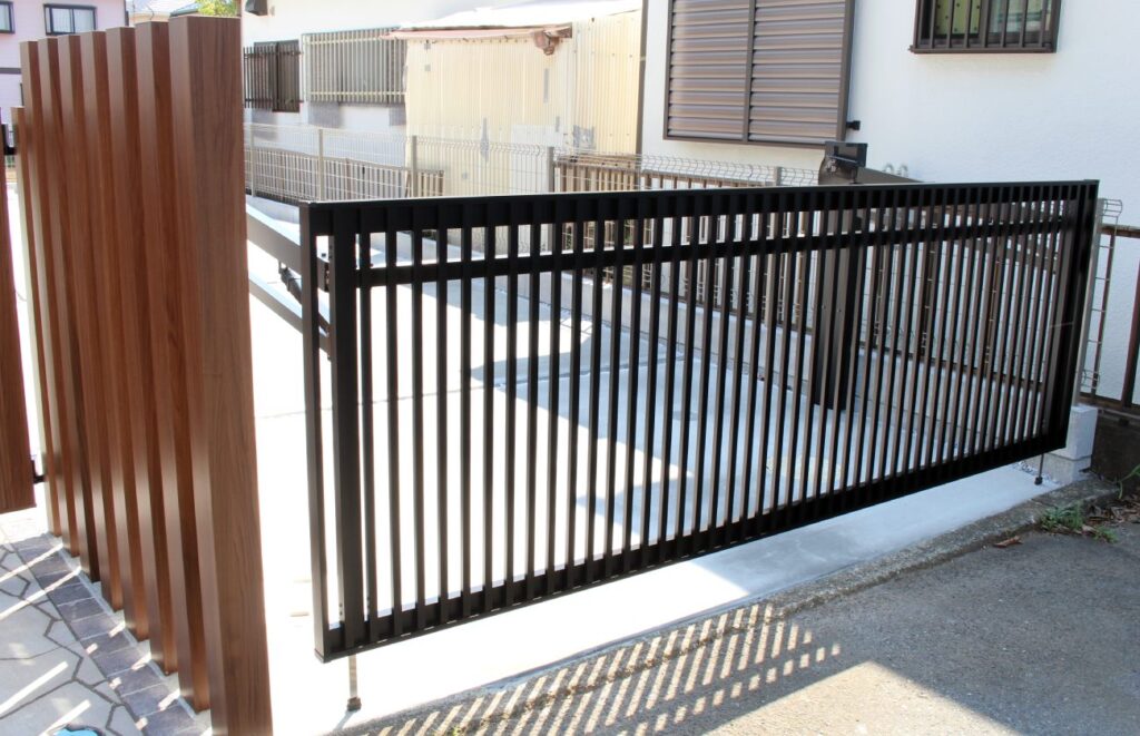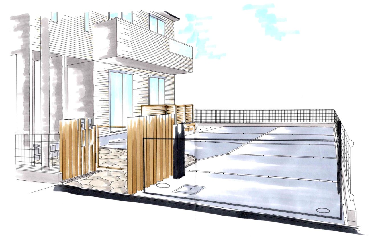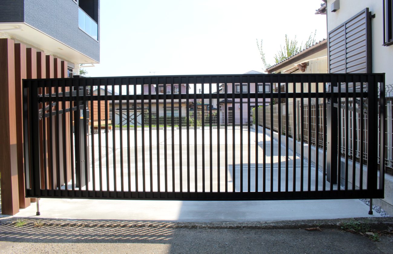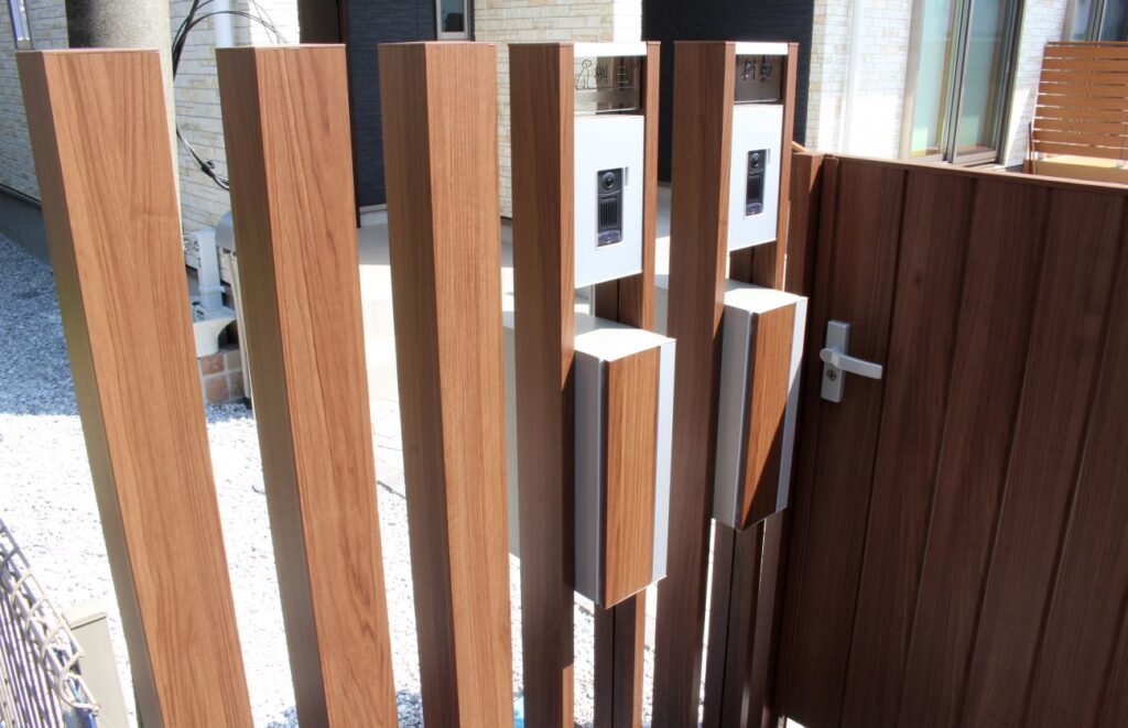 電動の跳ね上げ門扉の横にはアプローチへつづく門扉があり、2世帯の為同じ型番の機能門柱を設置し、アルミの枕木材を並べることでクローズ外構を演出しております。
