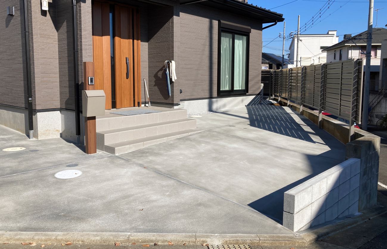 全面道路に大きな勾配が付いているこちらの敷地は駐車場及びアプローチの勾配計画を入念に行いました。ポーチ全面部分をサブ駐車スペースとして確保するには勾配や既存のポーチとの高さとのバランスを取ることが大切でした。