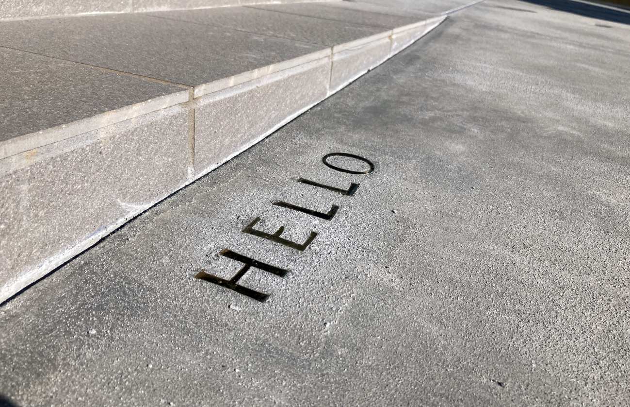 お施主様お気に入りの真鍮文字をコンクリート舗装面に埋込み、玄関前に楽しく可愛らしいアクセントを施しました。