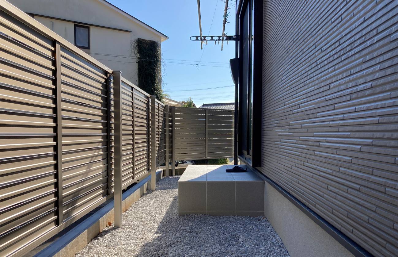 掃き出し窓の前にはタイルを使用したコンパクトサイズのデッキを作成し、庭への行き来をしやすいようにプランしました。隣地側や道路からの目線も遮れるよう、アルミ製のフェンスを設置しています。