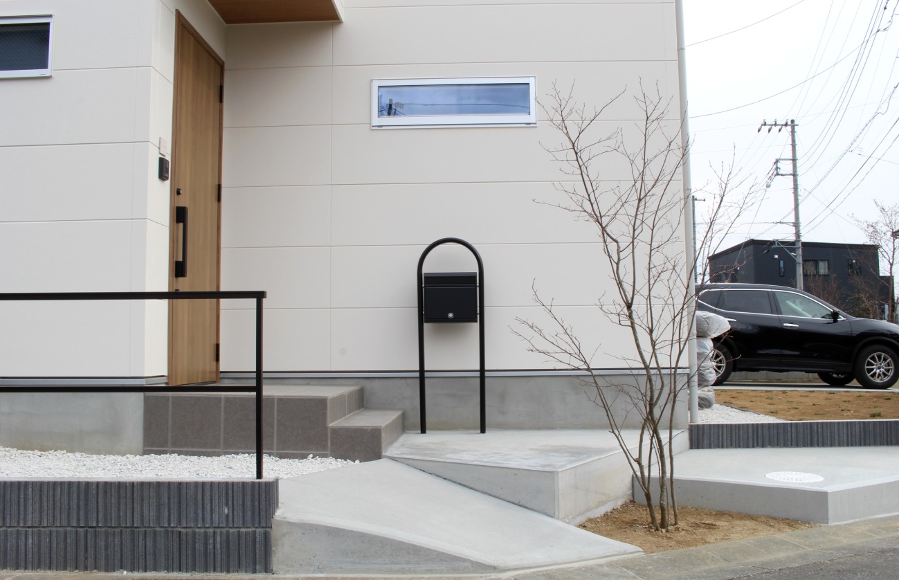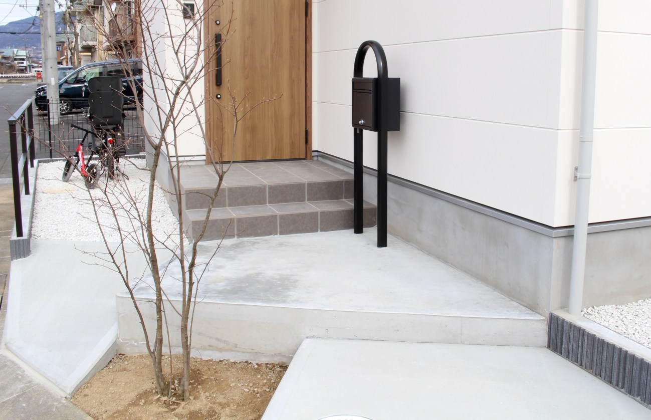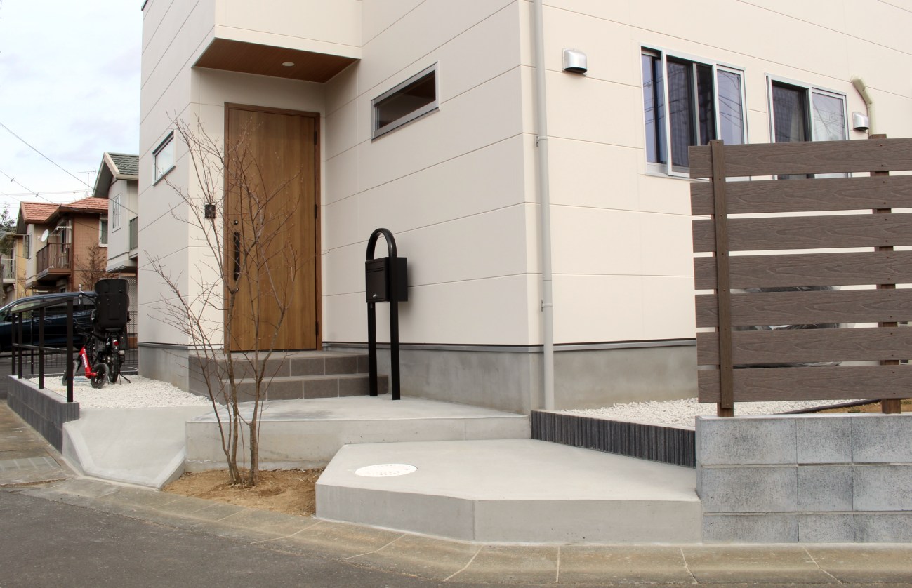 駐輪所用のスロープと動きのある階段に、シンボルツリーを取り入れたアプローチ周りを組み立てました。斜めの角地部分にありがちなデットスペース(無駄になる部分)を有効に使い、柔らかくあたたかい印象を与えてくれる植栽スペースを異形に収めています。