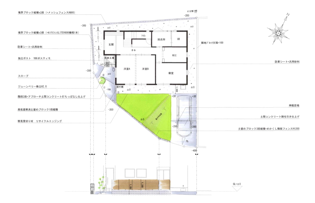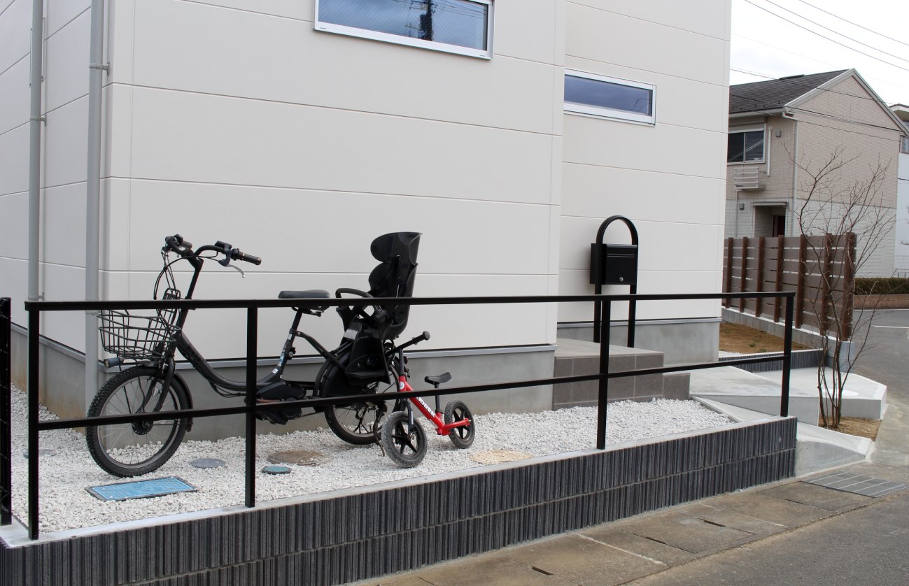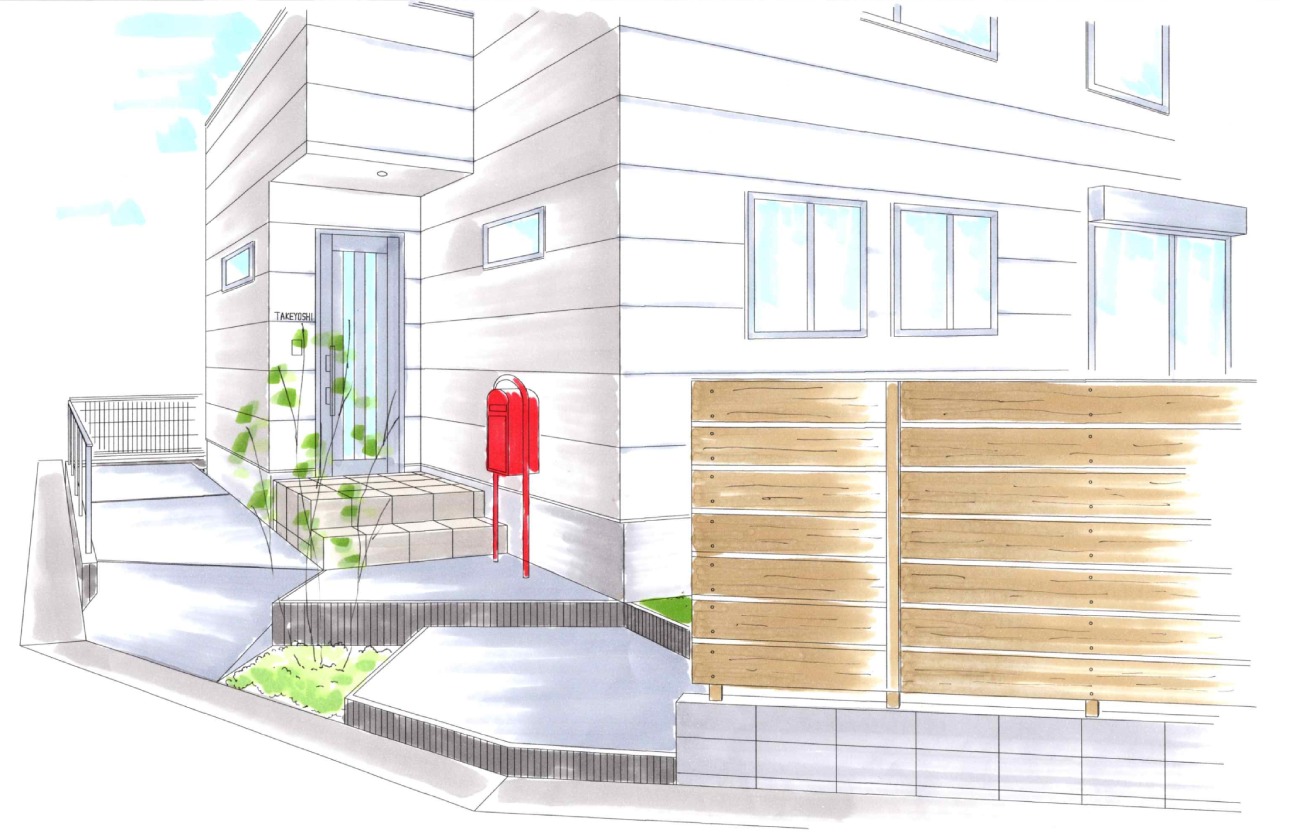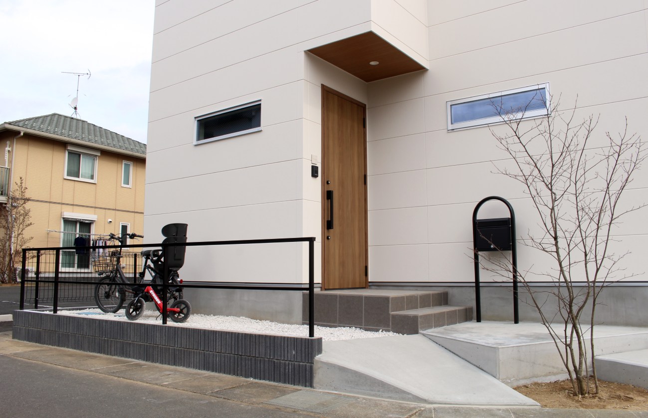 駐輪所用のスロープと動きのある階段に、シンボルツリーを取り入れたアプローチ周りを組み立てました。斜めの角地部分にありがちなデットスペース(無駄になる部分)を有効に使い、柔らかくあたたかい印象を与えてくれる植栽スペースを異形に収めています。