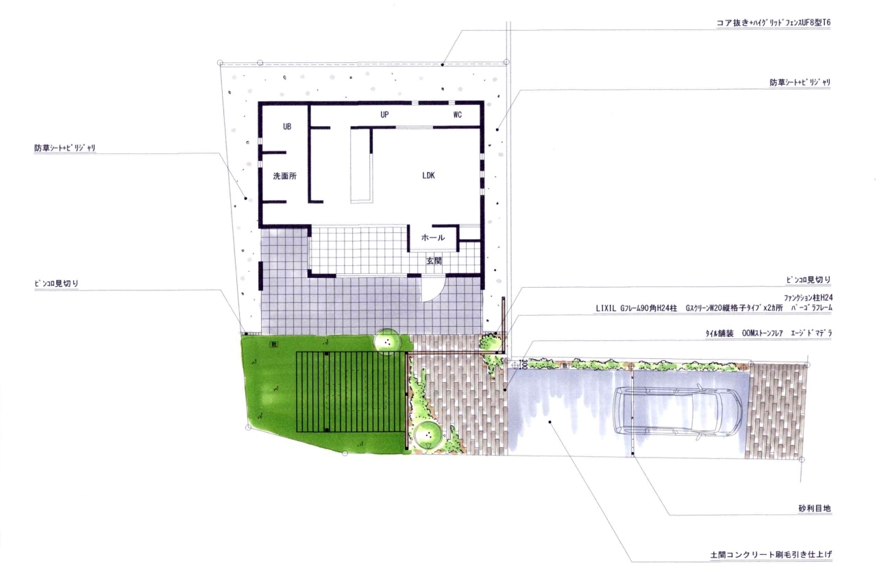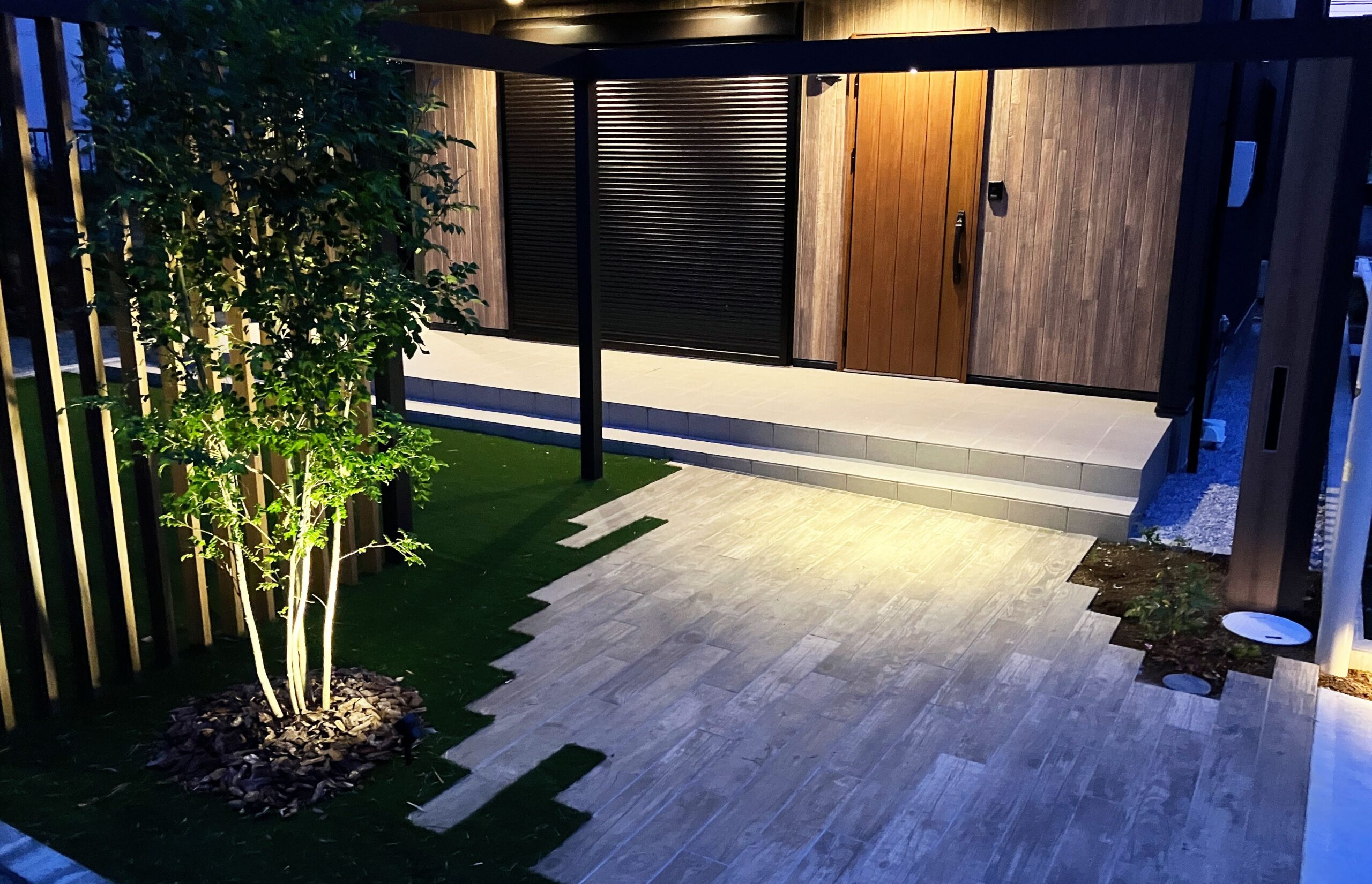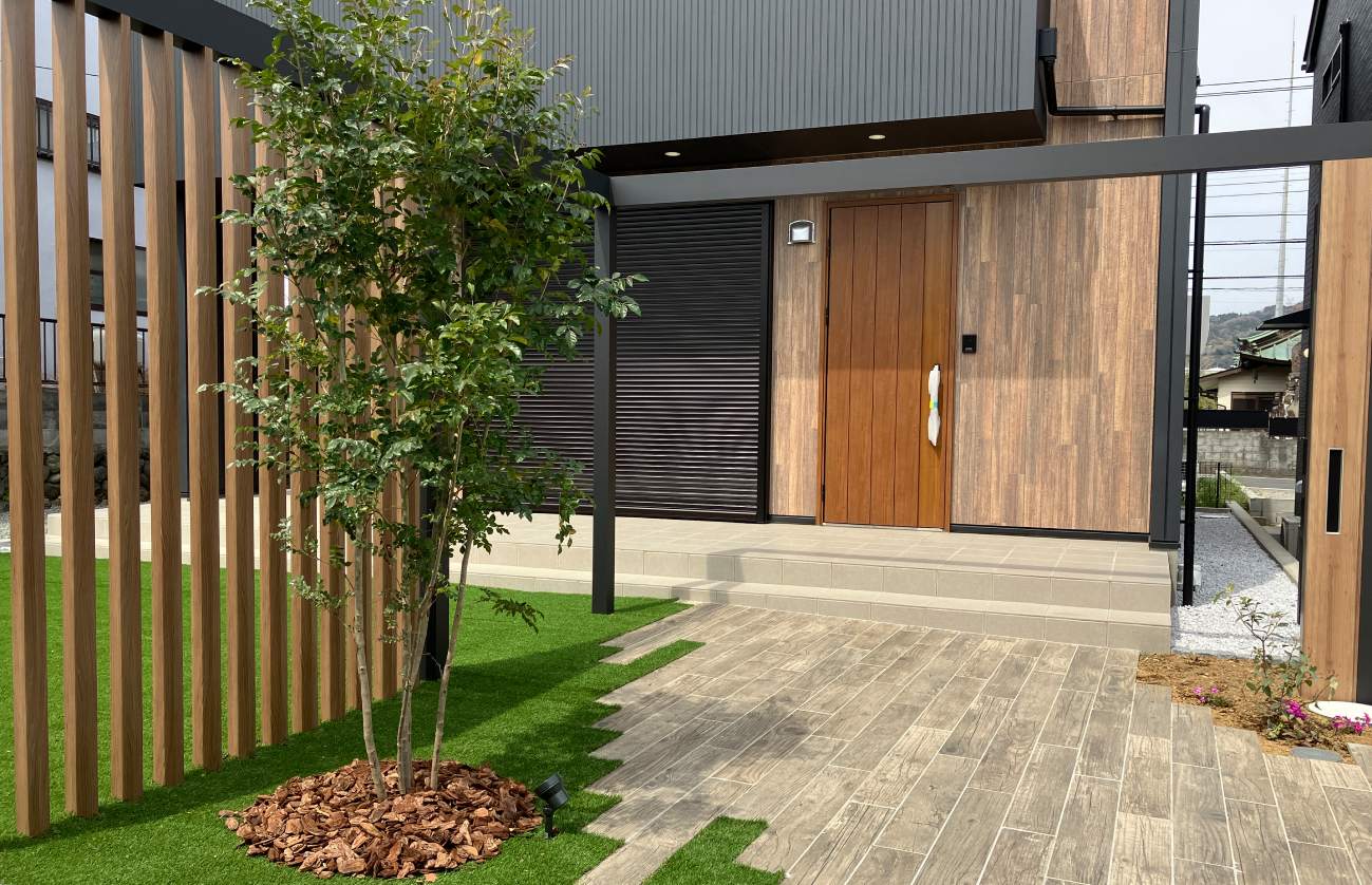 旗竿地でお悩みが多い「細長い淡白な道」を解消すべく、敷地入り口と玄関ポーチ付近には木目のテクスチャー入りタイルでしっかりと自然な風合いを演出し外を構えています。