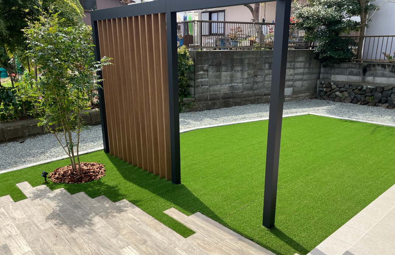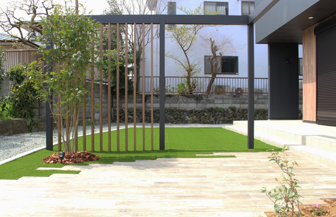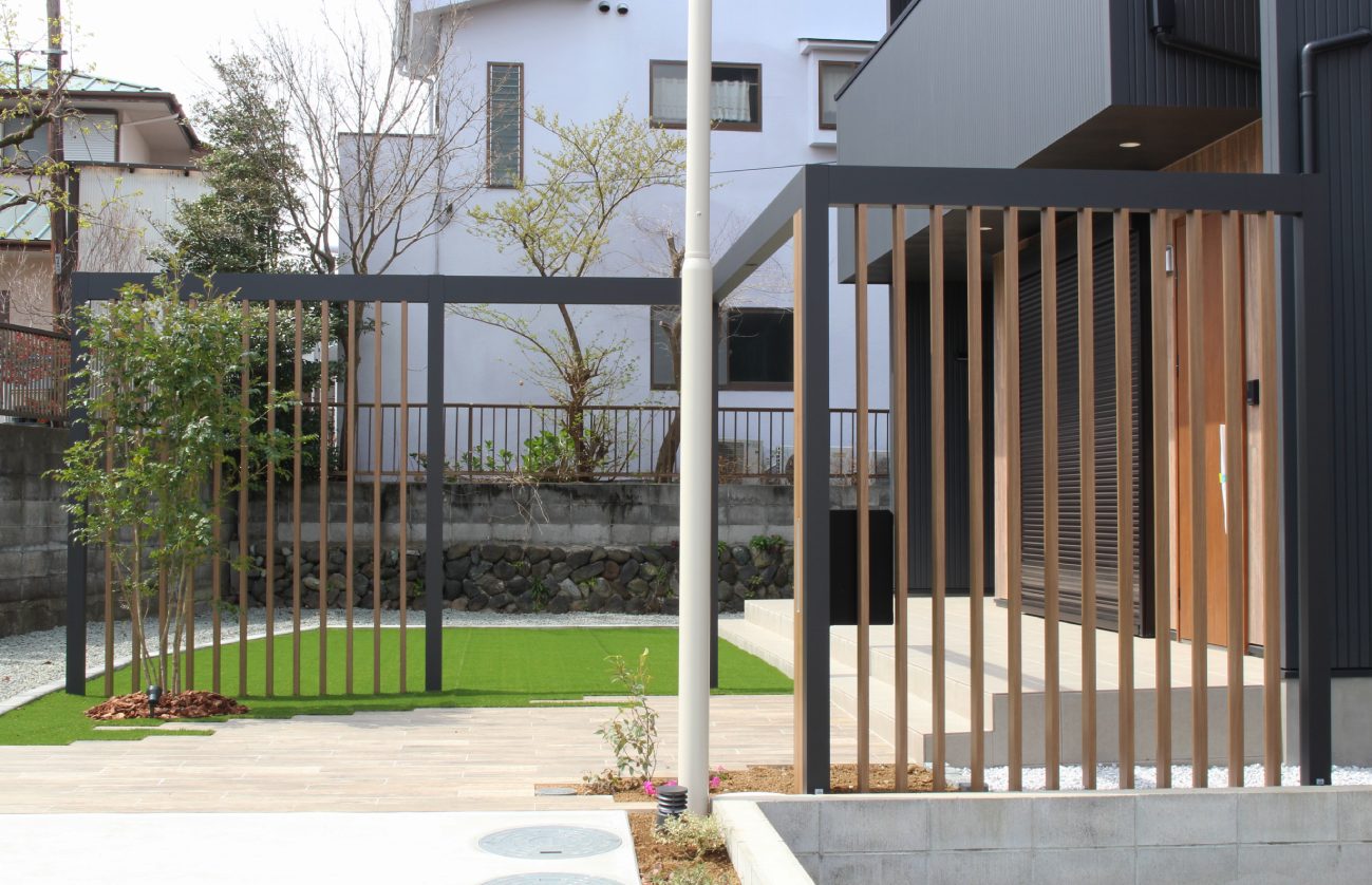 スクリーンはアルミの縦格子で目隠し効果があり、広いプライベート庭の開放感を心ゆくまで味わうことができます。